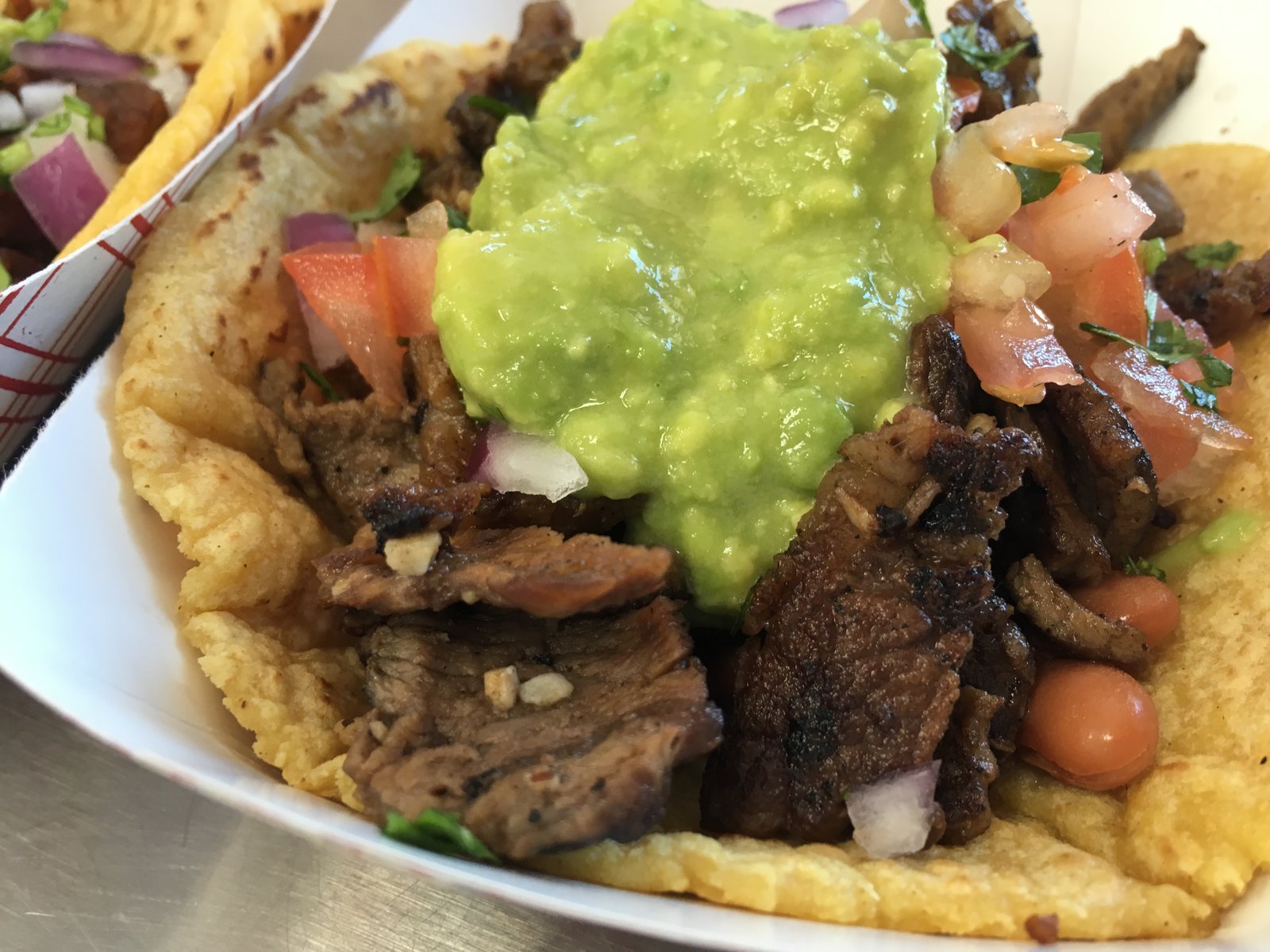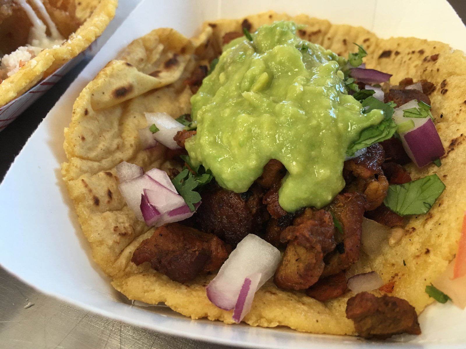 Carne asada taco. Tender, well marinated, flavorful steak. There are beans on this-and it goes together. The guacamole is fresh, not overly seasoned-it tastes like avocado, not lime, not garlic, not heat. I like it that way. Cilantro and onion round out all the flavors.