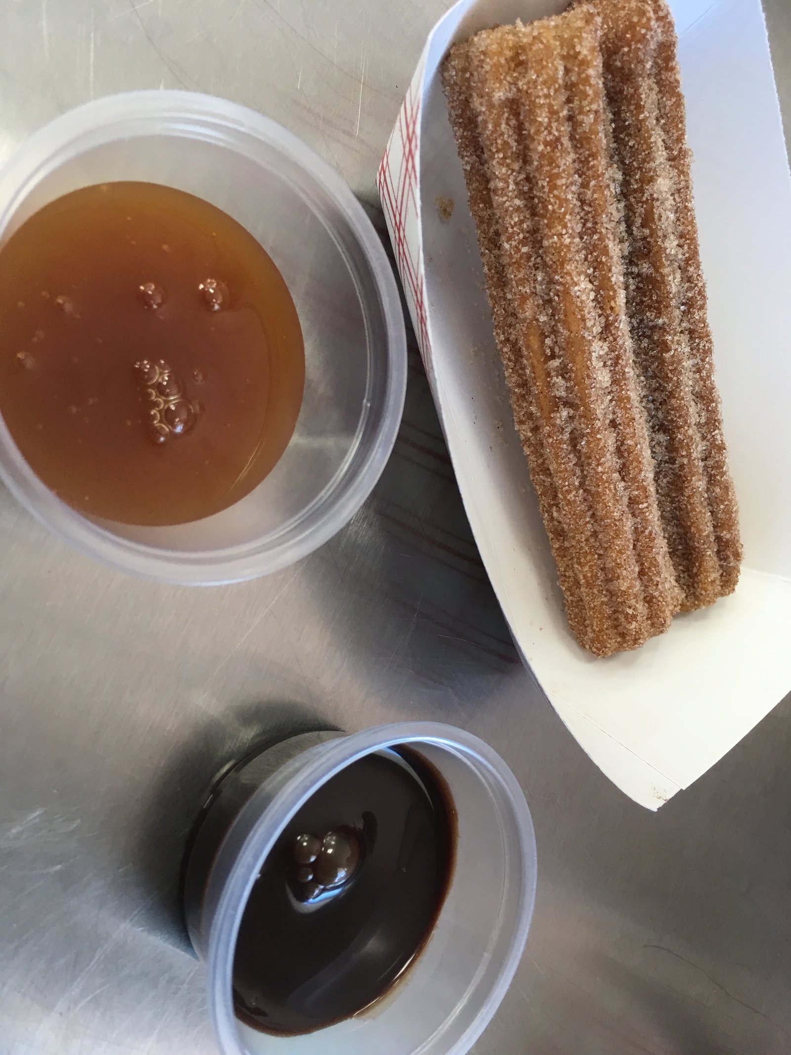 What the heck. Churros are on the menu.($2,75), fried to order, rolled in cinnamon sugar and topped with either name brand chocolate or name brand caramel or both or on the side. The toppings/dip weren't necessary; the churros are great with just the cinnamon sugar. Probably because, you know, fresh made.