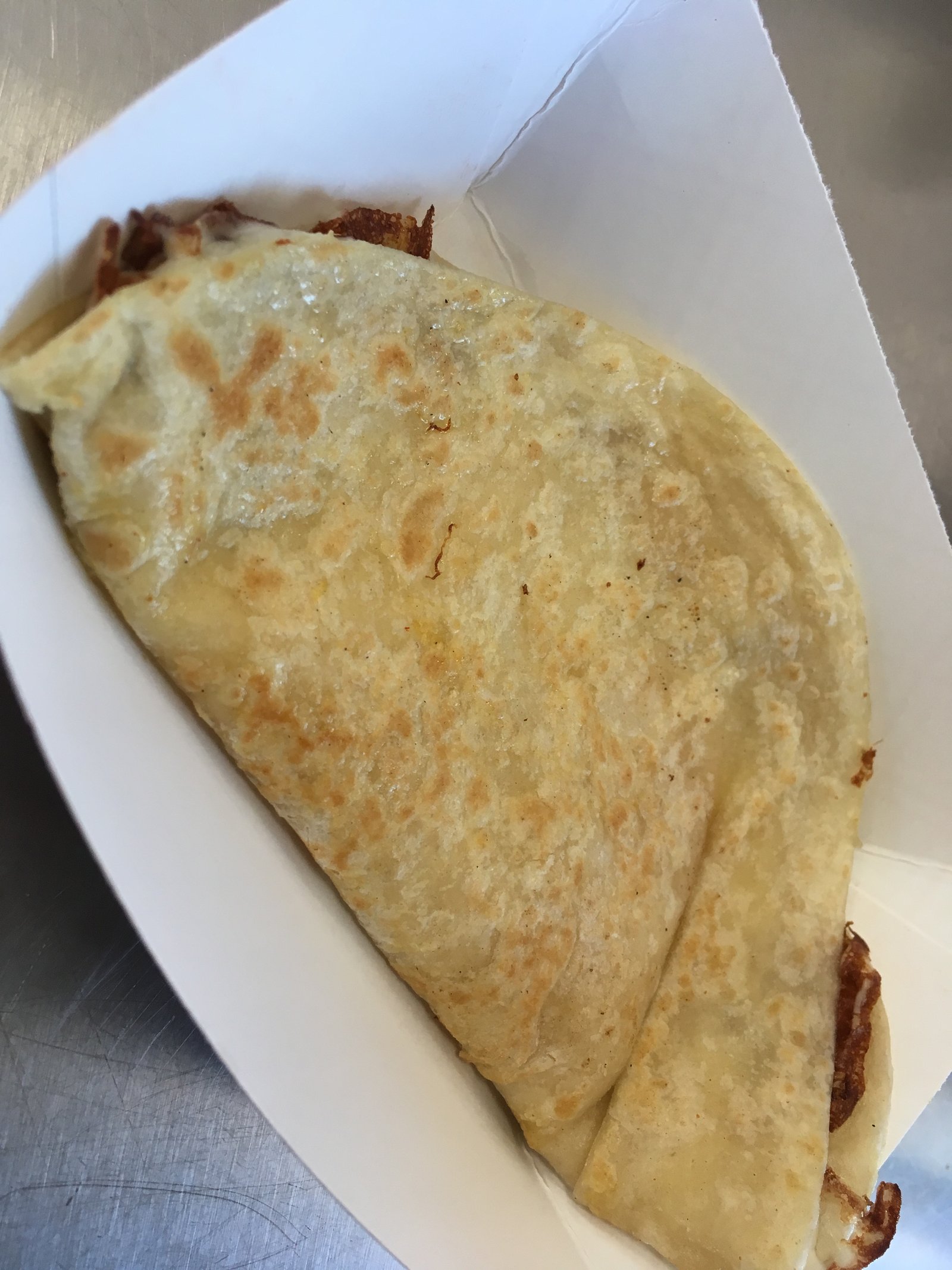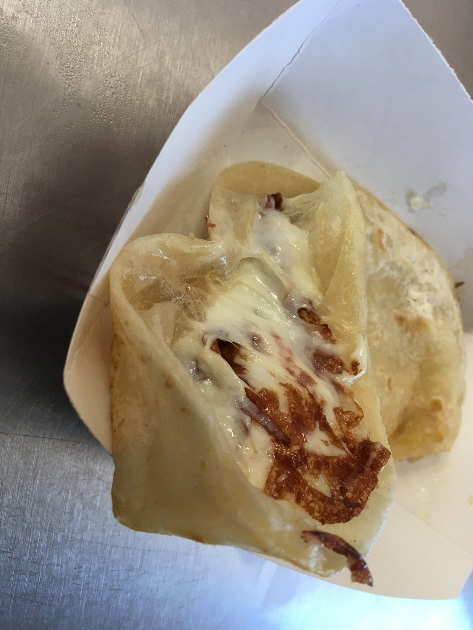 We could have stopped after threee tacos-it was a nice, light meal. But the menu…a quesadilla is $1.50. Had to. Fresh flour tortilla (could have had it on a corn tortilla, but, you know, for blogging purposes). Oaxaca cheese. Melty, crisped on the edges. Perfect.
