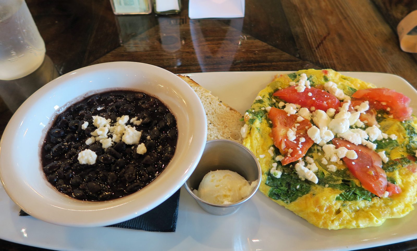 Still, like I said, the Missus wasn't really motivated. So one morning while She was working I decided to drop by for the "Brunch" which is served from 8am to 3pm Daily. My Server was really cheerful and friendly. After perusing the menu; I went for the Heirloom Tomato Frittata ($15) with Black Beans and Sourdough Bread.