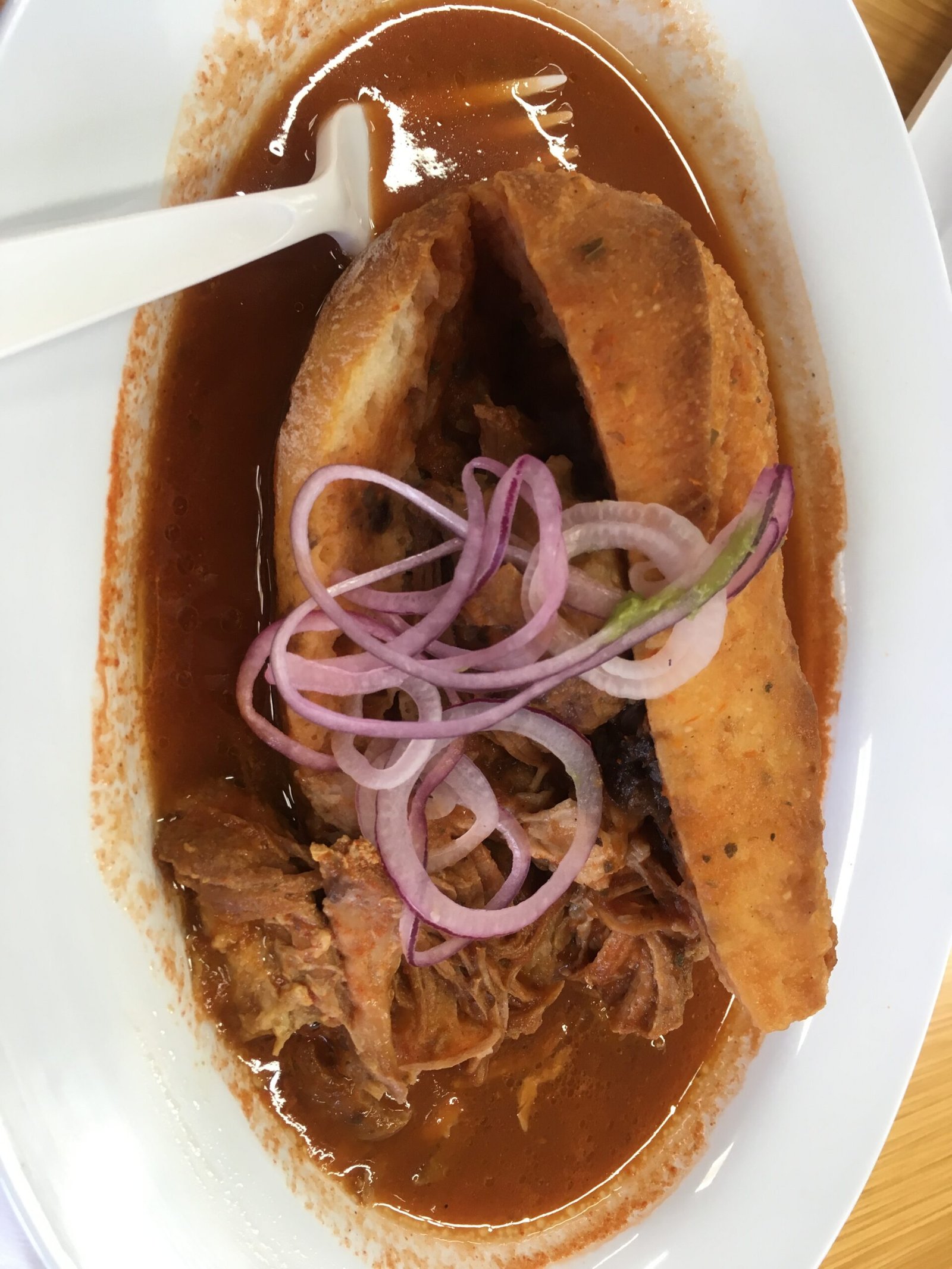 The Lunch Special of 1/2 torta and soup ($9.95). This was a smart decision, because apparently the full size torta is huge. This is a 1/2 size ahogada (drowned) torta. The bread is from Guadalajara. The meat is (wonderful flavored meaty and crisped) carnitas. There's a smear of flavorful black beans. The sauce, made with chile de arbol and tomatoes, is spicy and made here.