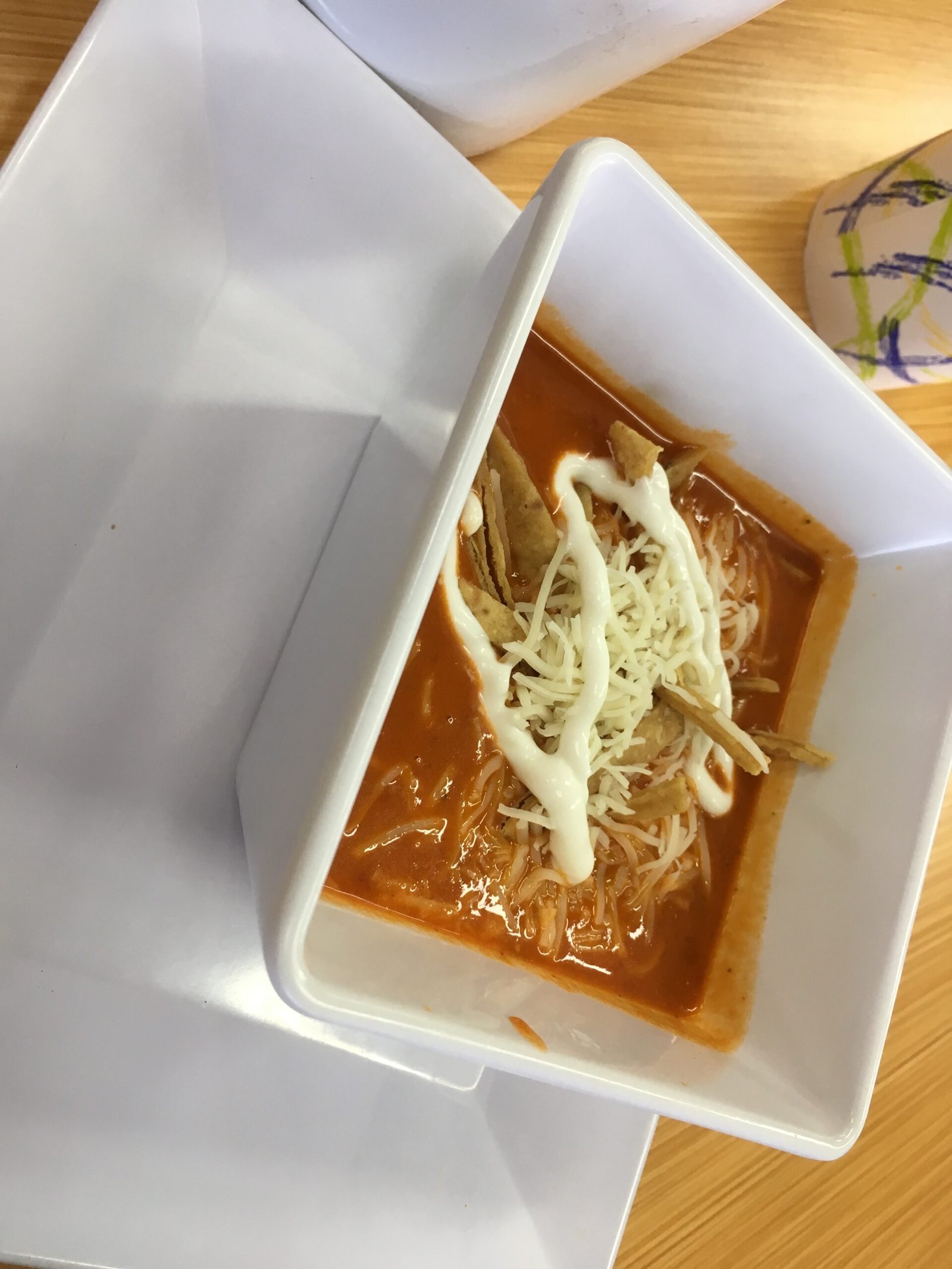 The soup is a 'proper' tortilla soup. **No chicken pieces** in it; just a good flavored chicken broth with garlic, onion, tomatoes, chile de arbol (so, it's spicy). It's thickened with tortillas and topped with fried strips of tortilla, cheese and sour cream. Hearty.