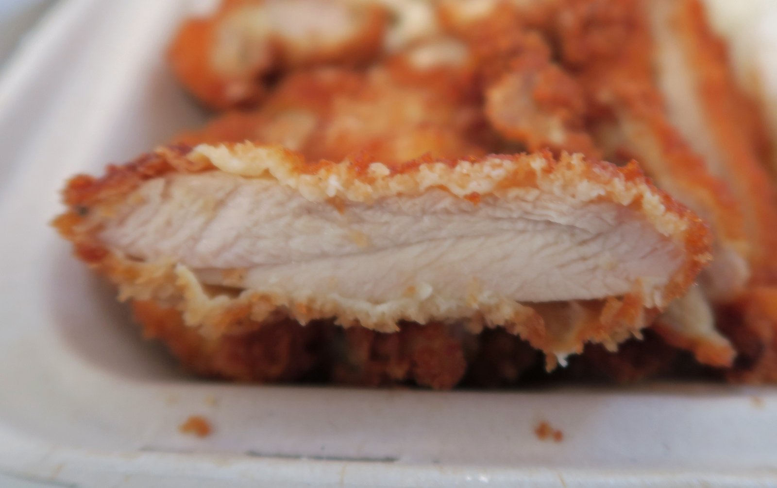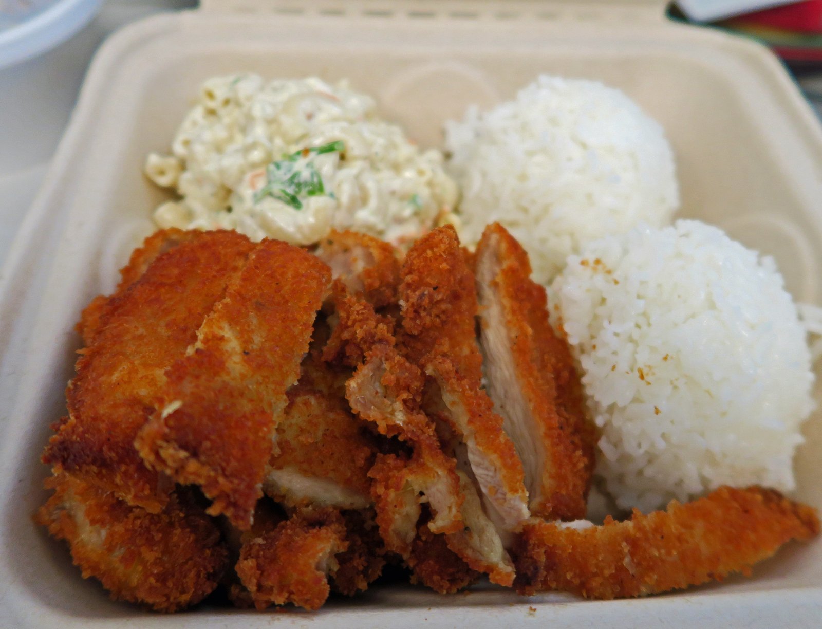 The katsu was still fairly crisp, moist, and tender when I got to the office. Notice something missing? There was no katsu sauce…..soft opening missives I guess. Luckily, I have a bottle of Bull Dog Tonkatsu Sauce in my desk drawer….but pitty folks who got their katsu this way and don't. The mac salad was still cool when I consumed it, the rice was a bit dry.