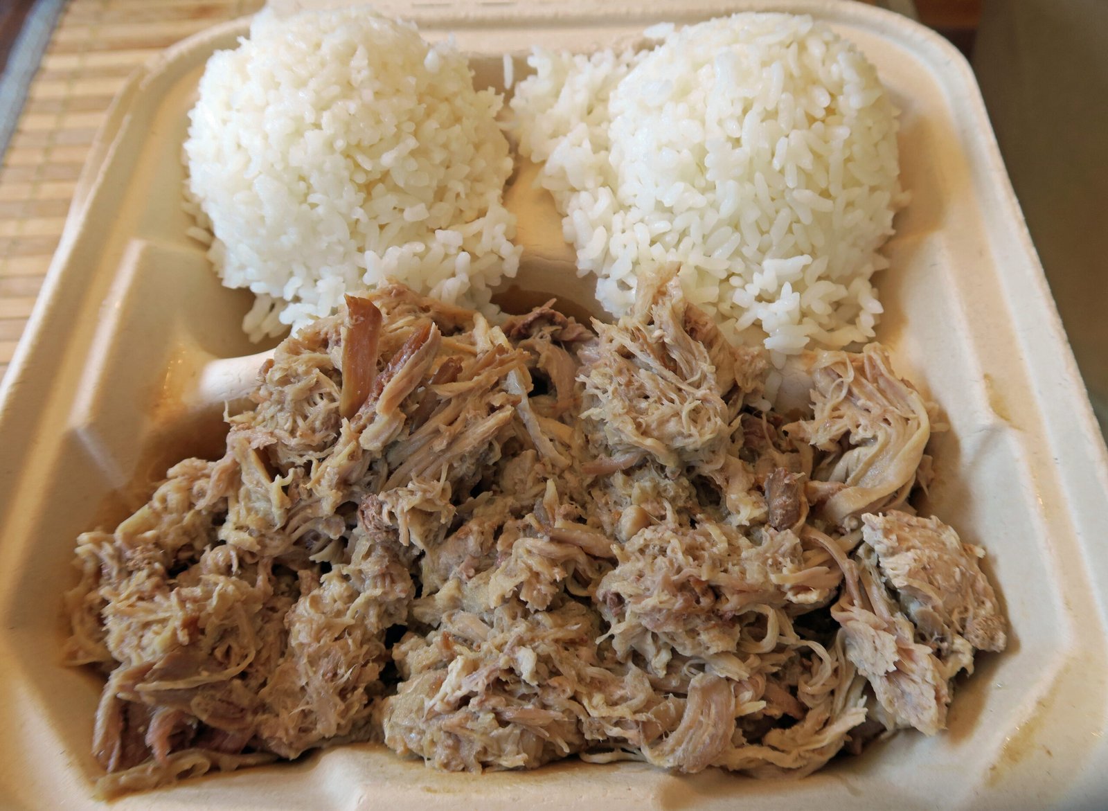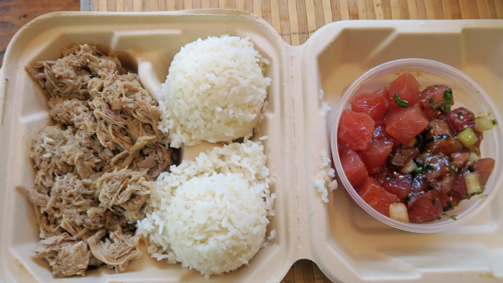 This was solid; good fish, though not great poke in terms of flavor. I had seen kalua pig on the menu and the Missus also wanted to try the poke so I returned the following weekend….oh my, even worse traffic, and I eventually had to pay for parking in the CVS lot since none could be had. I guess I could have headed on down early; like a couple of hours before the noon opening time of It's Raw…..Anyway; I got the "Pig and Poke" ($20), and selected the Kimchi Poke and the Furikake Poke. I got a half pound each of the kimchi and wasabi poke for the Missus….$45 for take-out…..whoa.