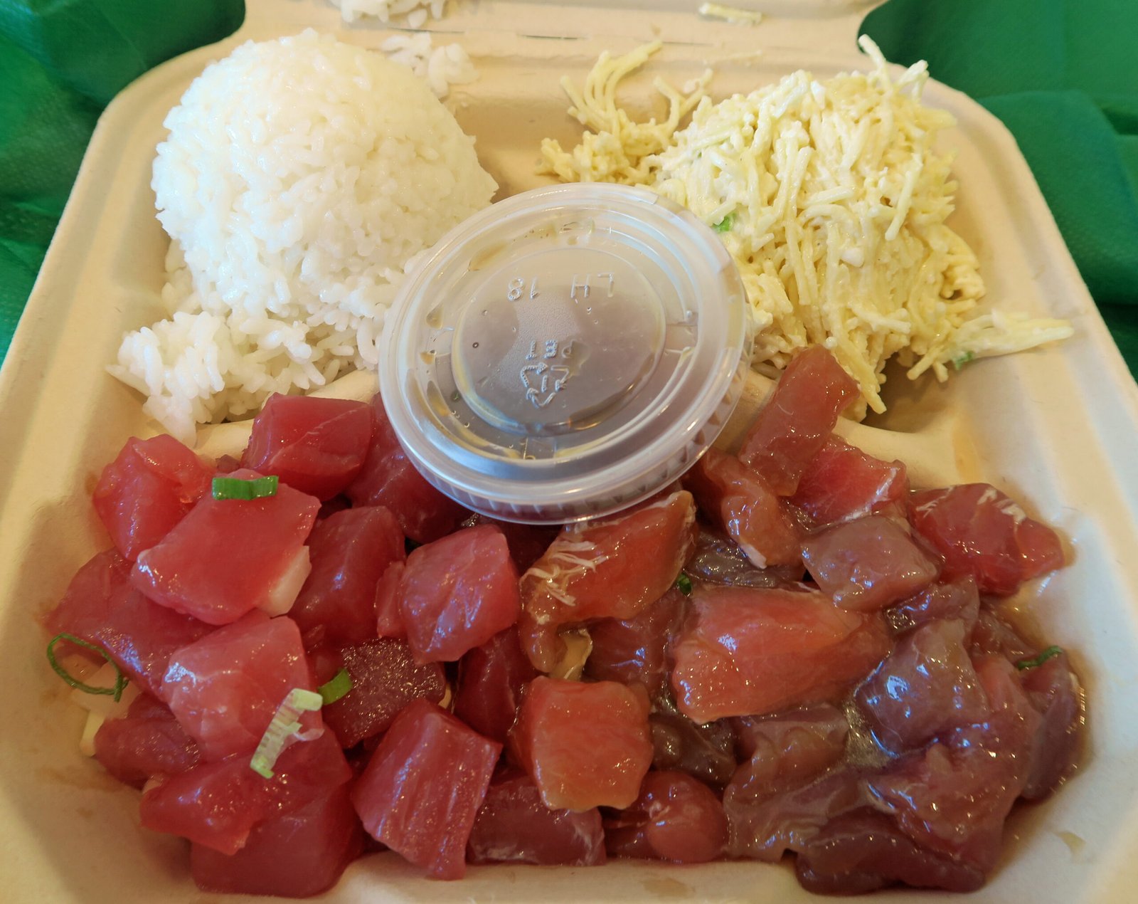 I liked the look of the fish in the trays. Not too many options, which was fine with me. I just got a Poke Plate ($15) which comes with two choices of poke. I also went with one scoop rice, one scoop mac salad.