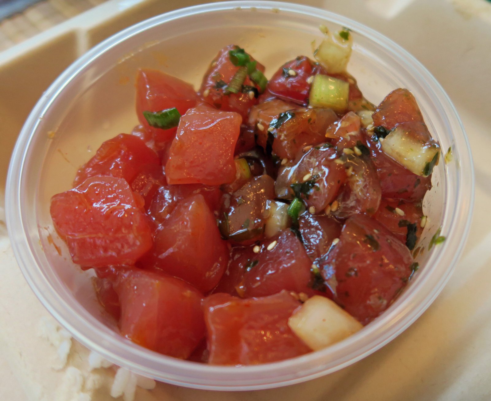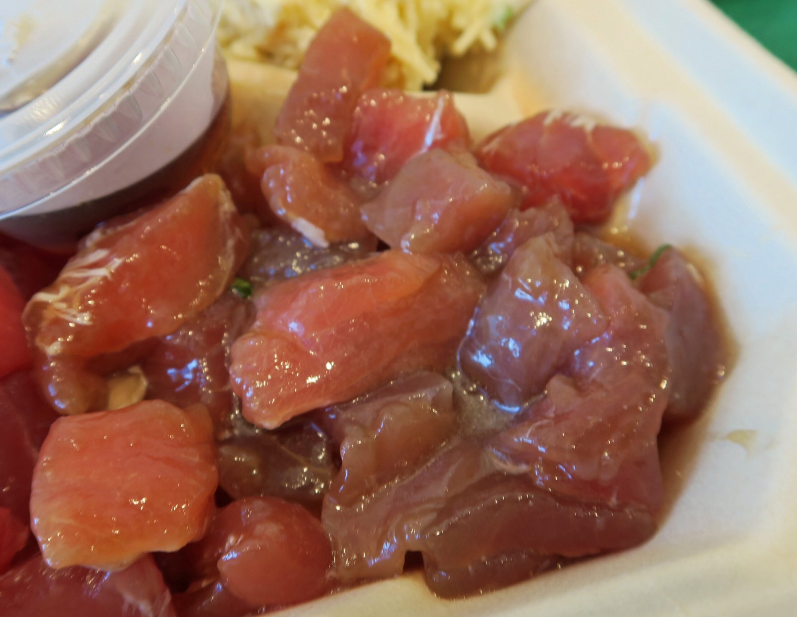 The rice was nicely made. The mac salad was actually spaghetti salad, very plain, not too much mayo, nicely chilled and seasoned.The shoyu poke came with sauce on the side. It was super salty and lacked depth, but even thoguh the fish was a bit "dry", I couldn't gripe about the fish quality. The wasabi poke was better; well sauced, but overly salty, and fairly light in terms of wasabi. While there was some "sugi" (connective tissue) on several pieces, this was the better of the two poke.