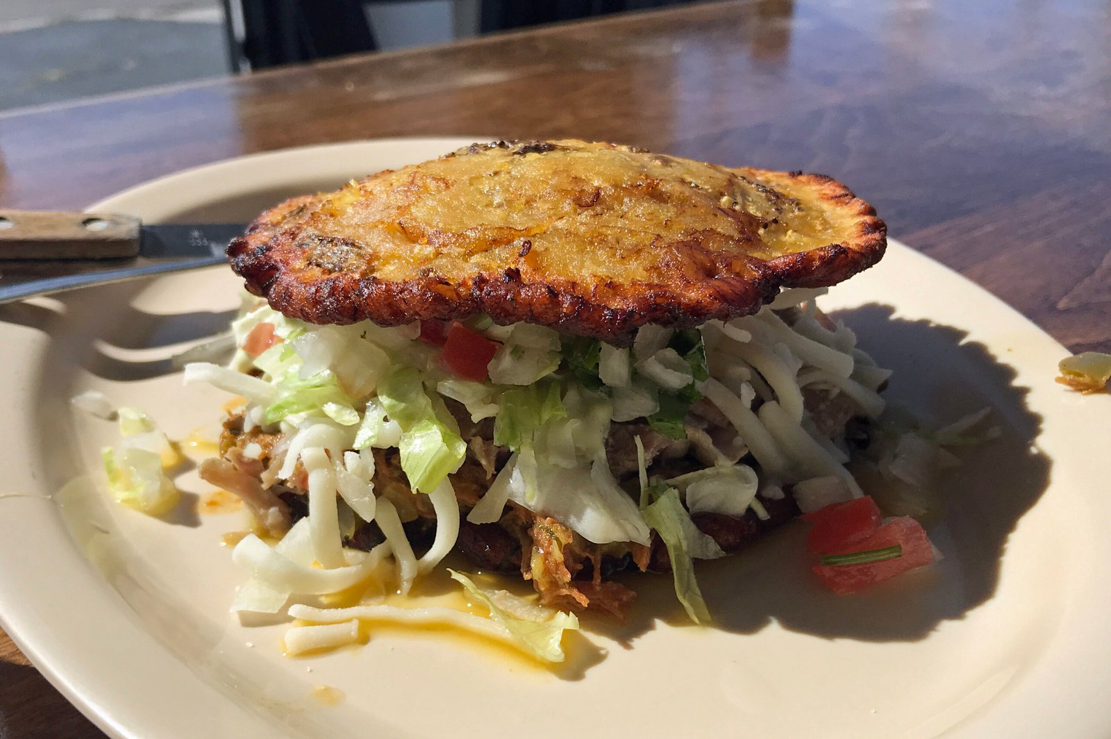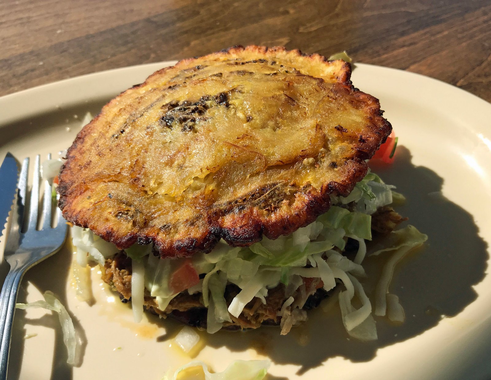 The very sweet young lady working was so nice and friendly….having very little experience with Venezuelan cuisine (other than arepas), I knew I was out of my depth, so I asked for a recommendation. Something other than arepas. She asked me if I liked plantains, which I answered with a very enthusiastic "yes". So she recommended I try the Patacon, the fried plantain sandwich. So I selected the Carne Mechada, shredded beef version.