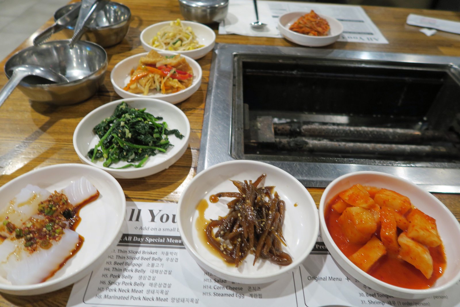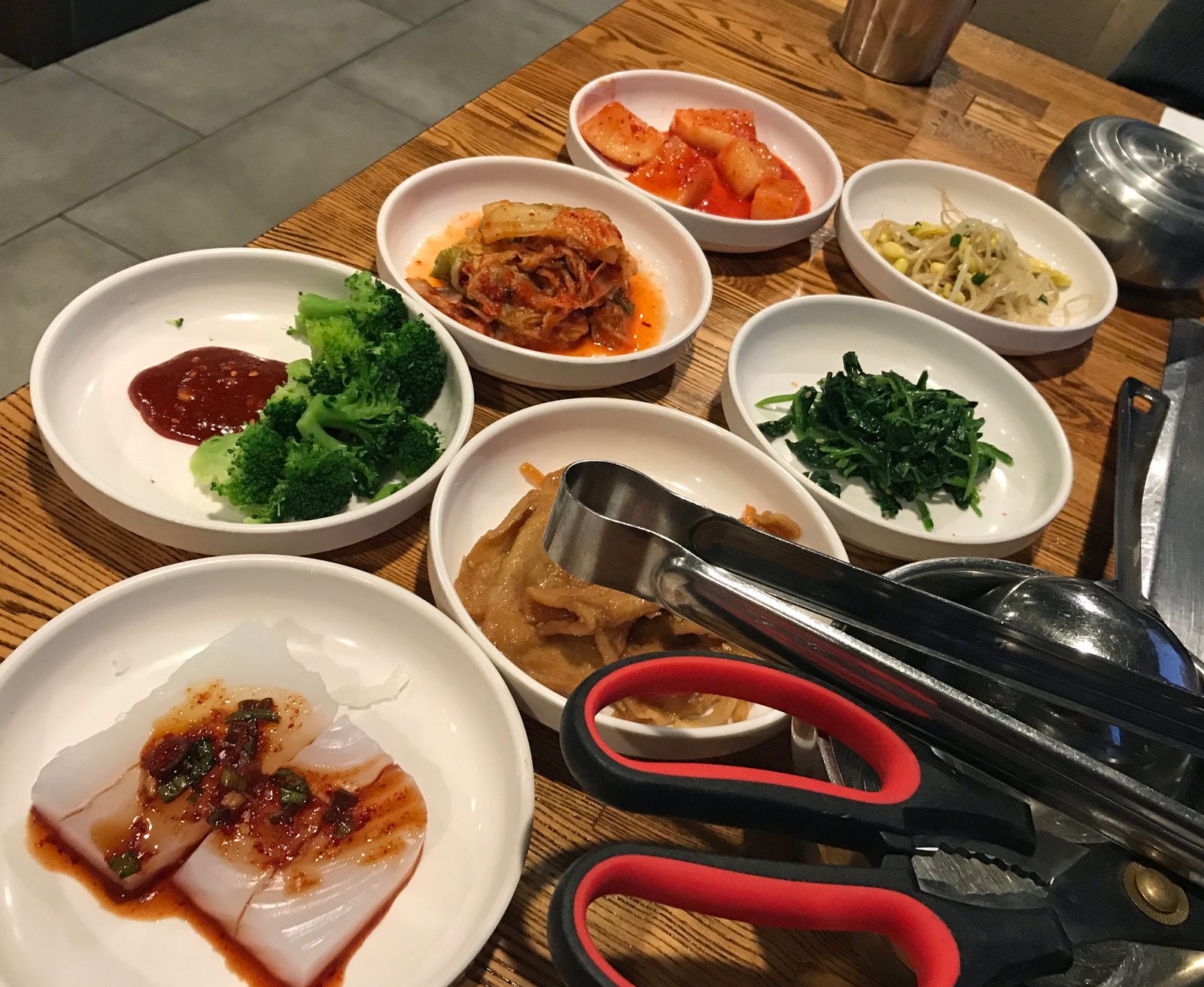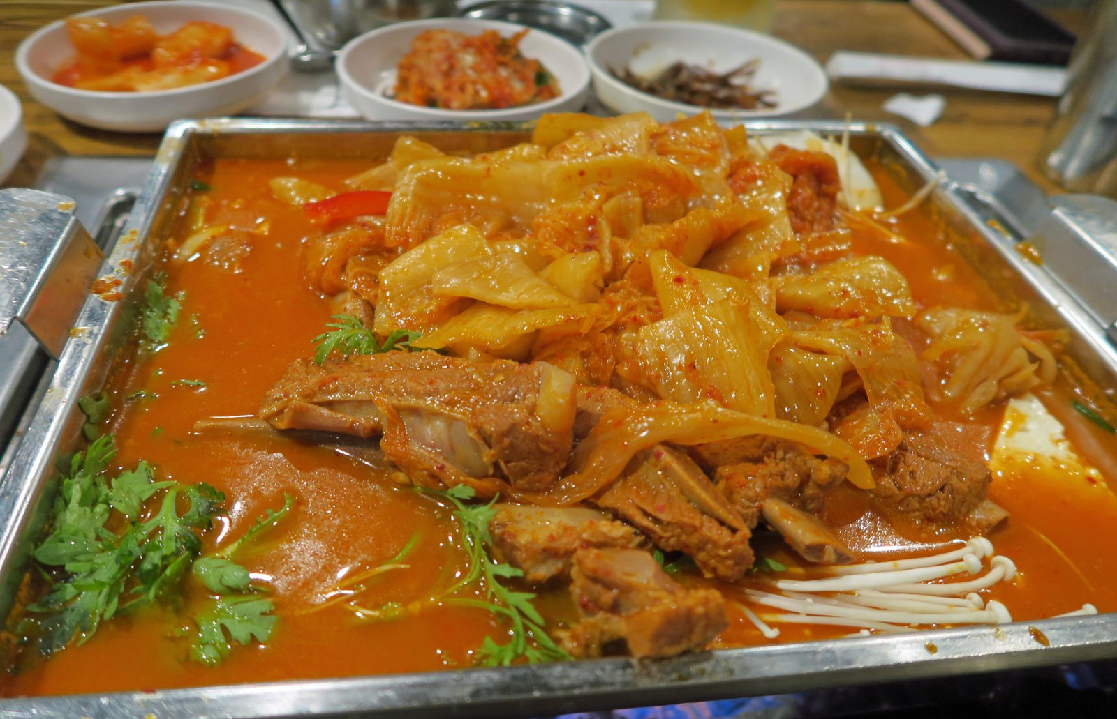 It's a dish that uses "Mukeunji" which is poggi kimchi that has been aged at least six months. It's got a much stronger fermented flavor and is what we eat at home. Along with Daejji Galbi; braised pork ribs; which here add a nice porcine touch to the dish. There's a couple of huge pieces of kimchi that is sliced before placing the pan over the heat. Throw in some nice and meaty king mushroom, tofu, enoki mushroom, ssukgat – what I grew up calling "shungiku"; chrysanthemum leaves, and some rice cakes, this makes for quite a comforting meal.