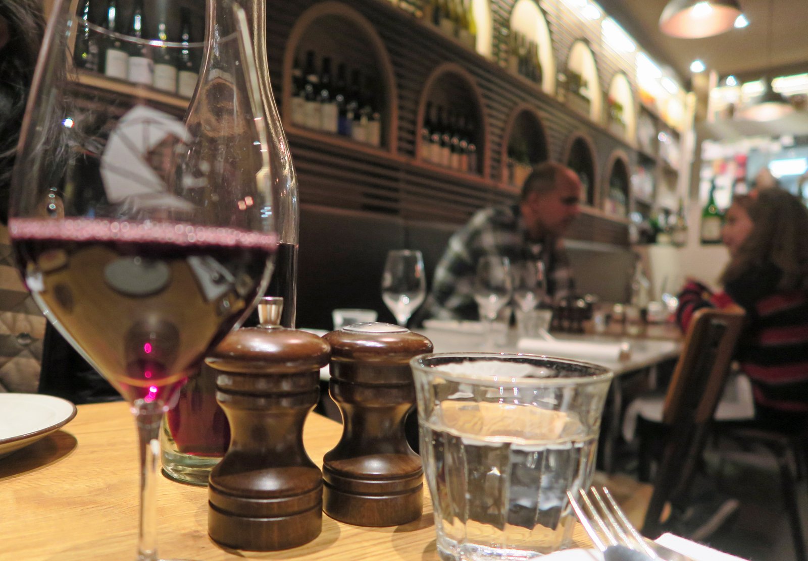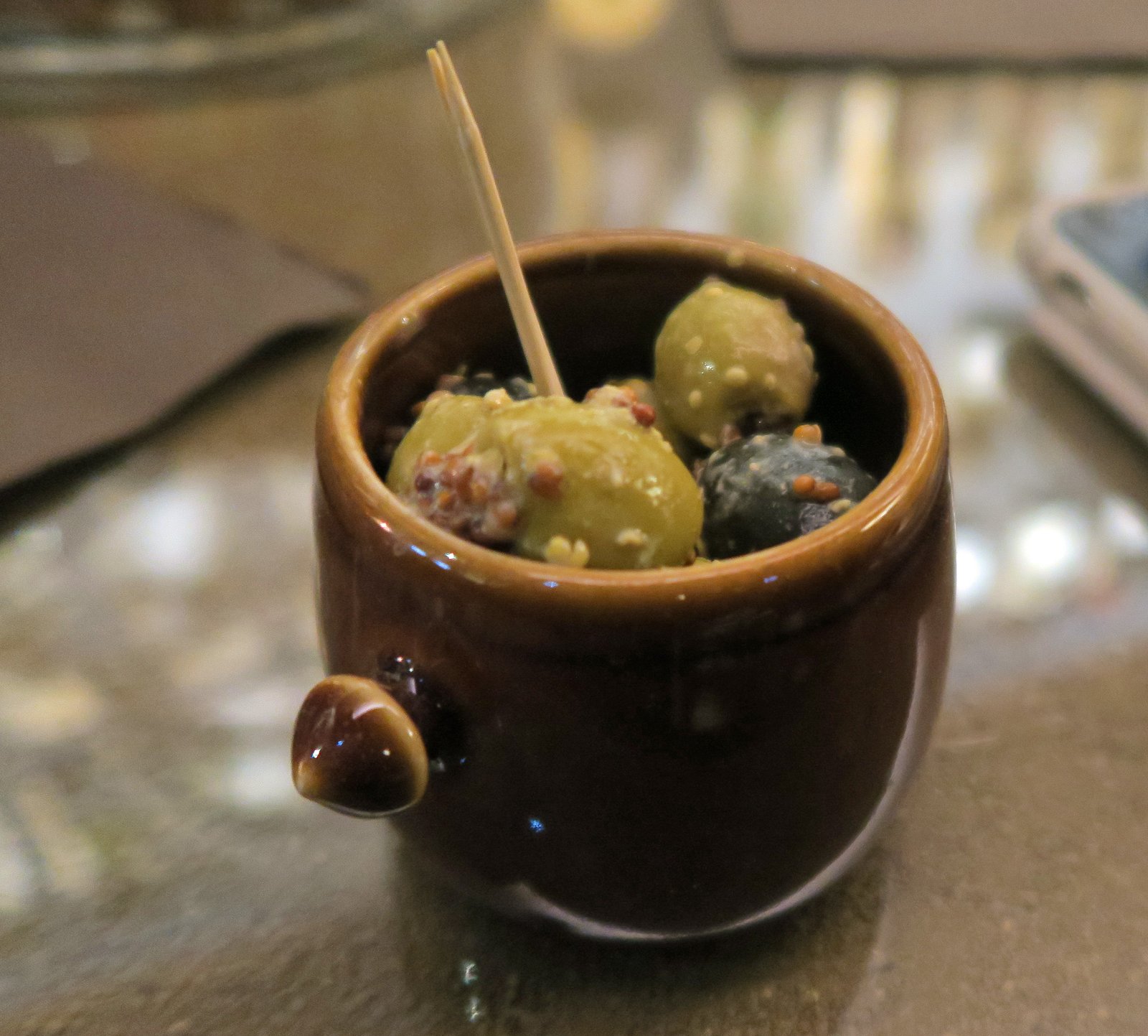 We enjoyed the small, rustic, with modern touches of the Wine Bar. The bartenders were indeed quite friendly. The Missus enjoyed a glass of red and I got a Kir. We were given some olives with mustard.