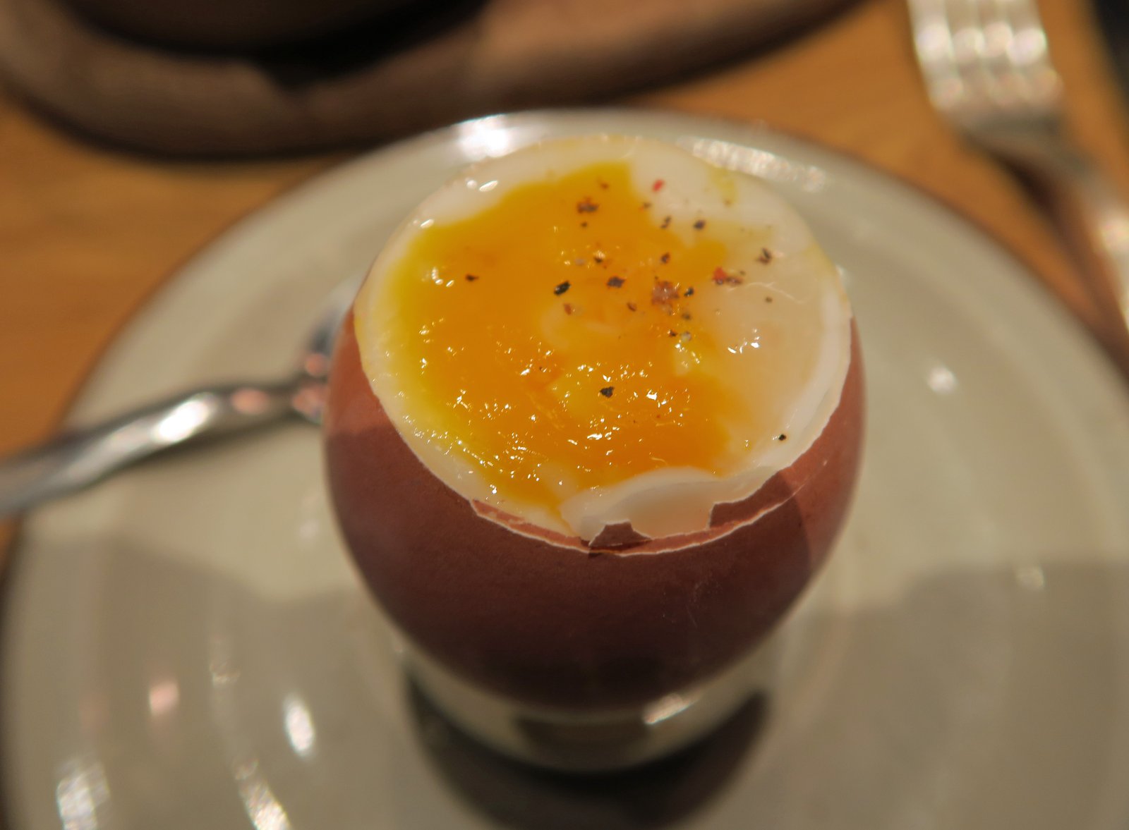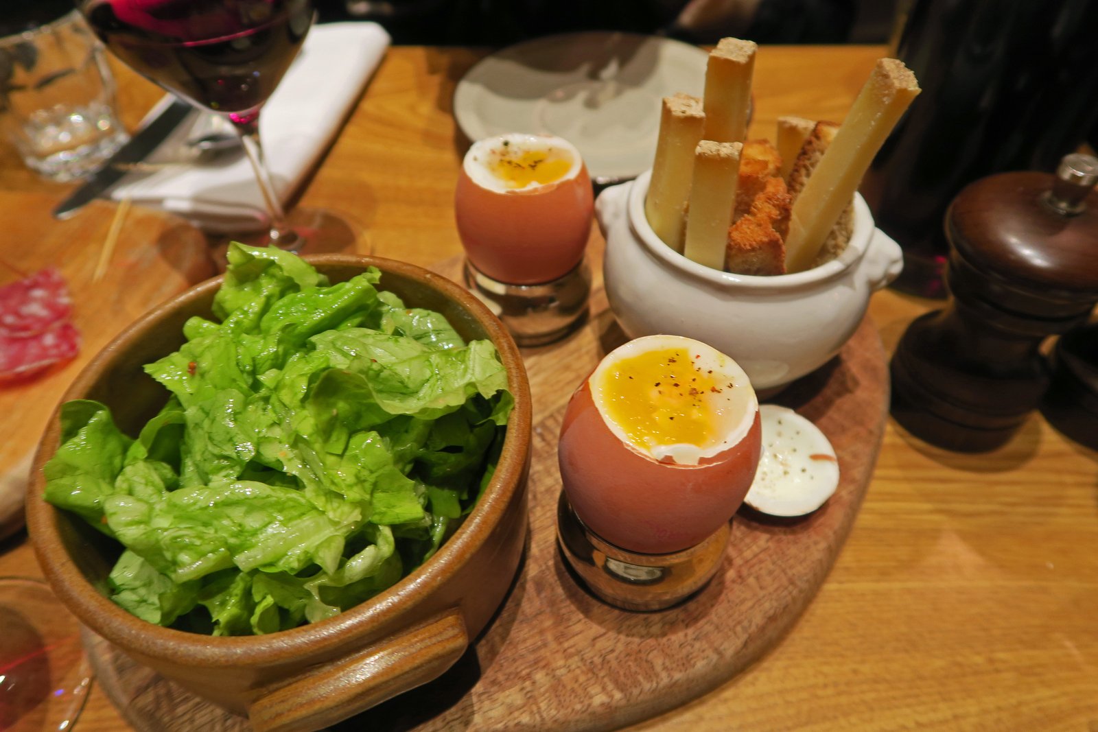 We started with a dish I'd seen in a couple of posts. "Oeuf a la Coque Fermier Mouillettes de Beaufort 24 mois" (9€ – about $10/US). Whew, that's a mouthful! This was basically soft boiled eggs, served with Beaufort, an Alpine Cheese, aged 24 months.