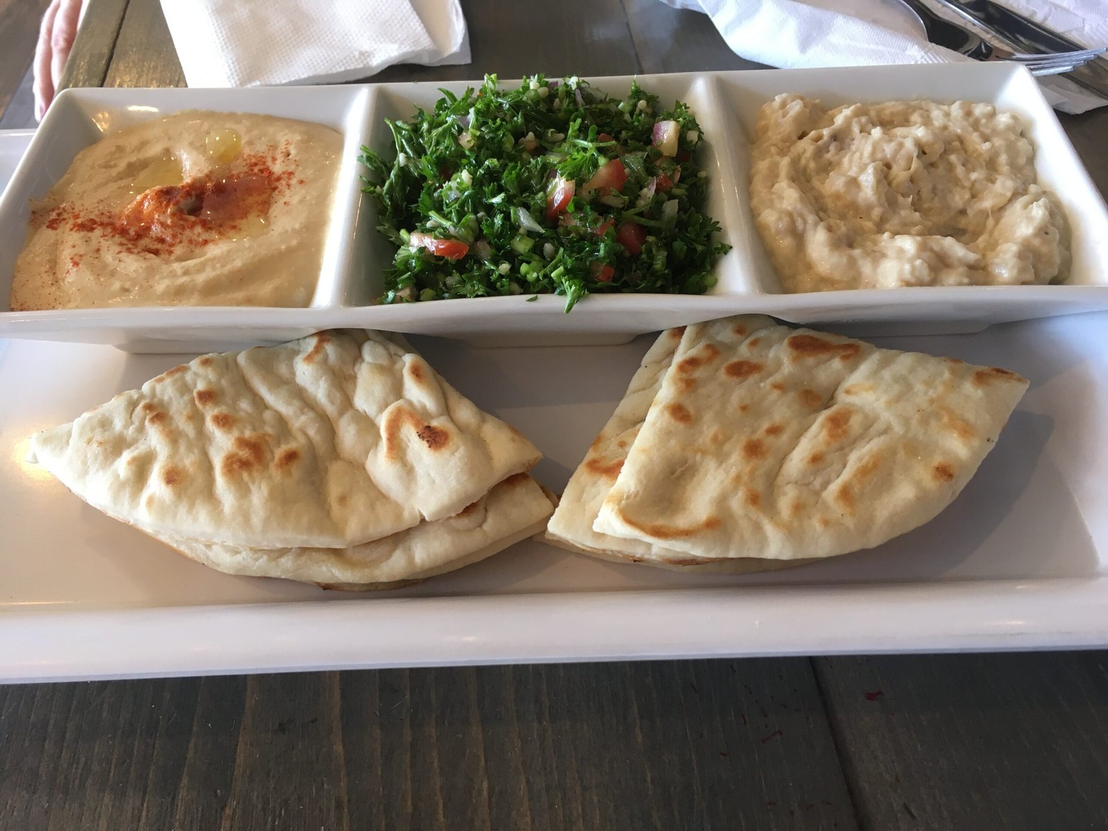 The Mezza Trio ($6.99). I chose the classic hummus, tabouleh and baba ghanoush. This was a nice way to try a few items on the menu without ordering full sizes. Each item was definitely fresh made and bright with flavor. The classic hummus was very fresh; the Greek olive oil is unique and the tahini with its sesame stood on its own, with the garlic not being overpowering. The olive oil and lemon dressing on the tabbouleh made the parsley, tomatoes and finely chopped cucumber flavors jump while the crunch from the cracked wheat bits rounded out the texture. The ghanoush had a great smoky flavor, great tahini/sesame flavor and smooth texture. I was eating it with a spoon and not using the accompanying pita bread.