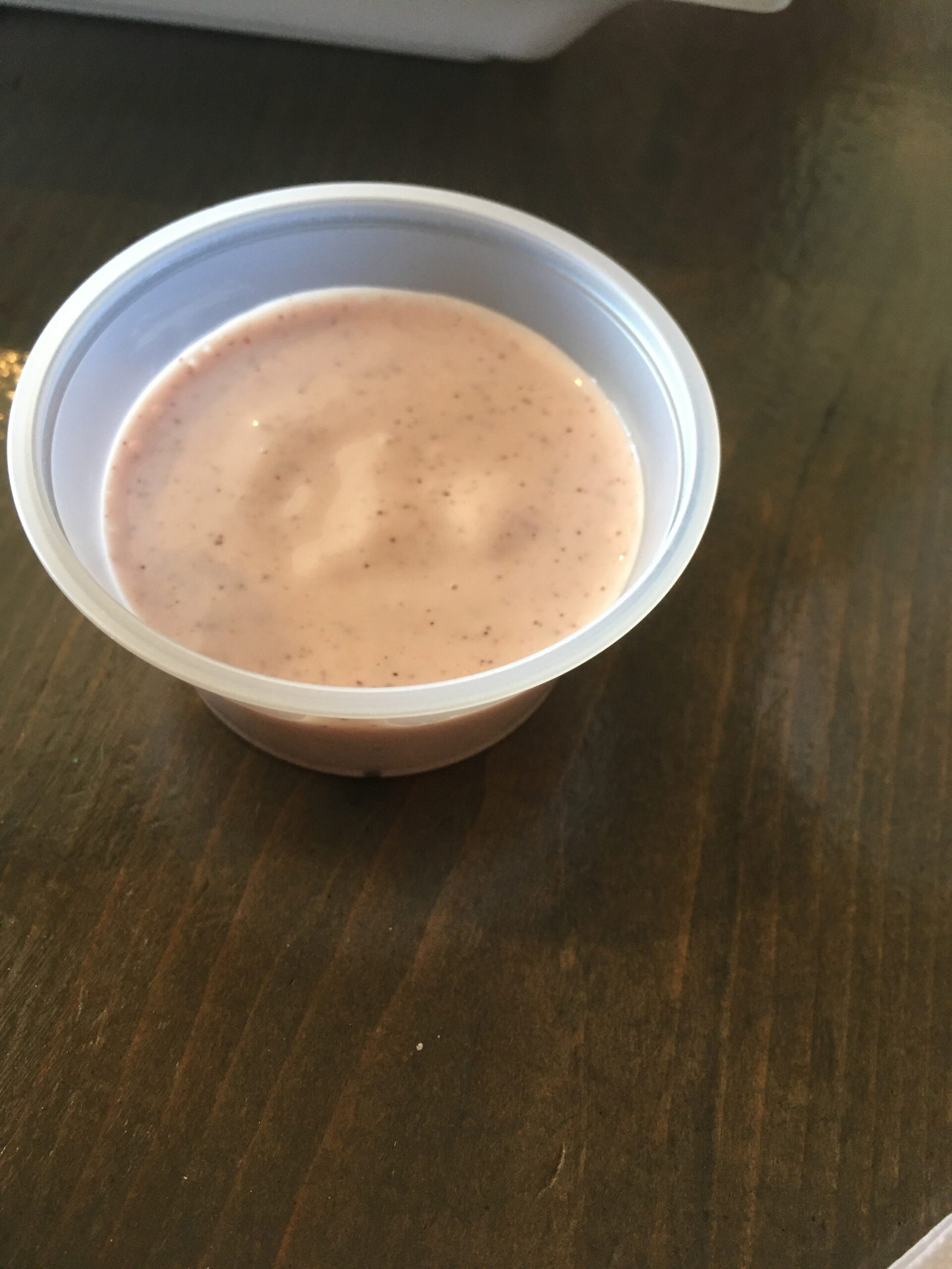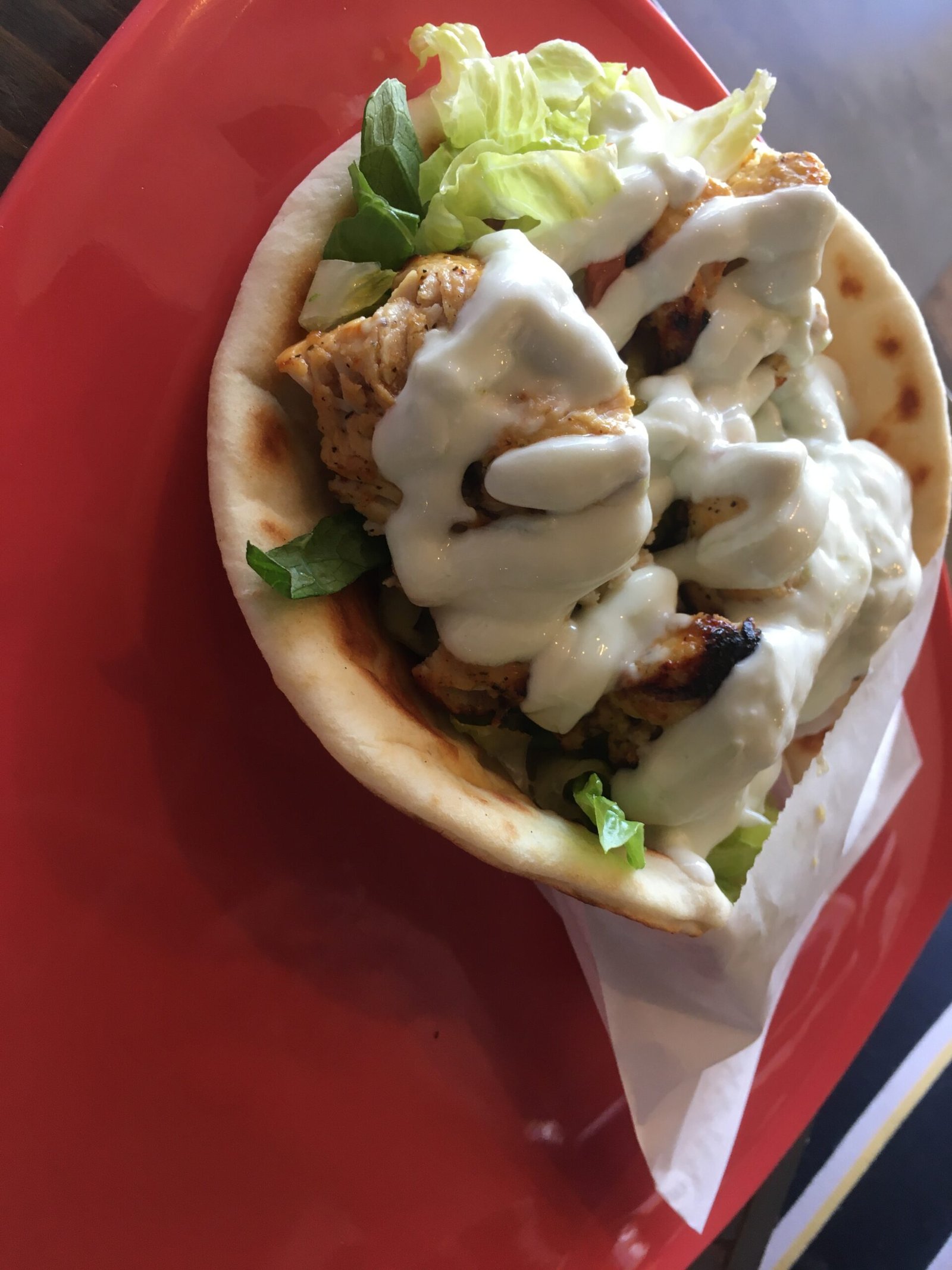 We were here on a Saturday, when the Pita of the Day was Chicken Souvlaki ($6) (you can see the daily pitas above and in front of the menu which is on the wall in the second photo above). Moist, flavorful nicely grilled chicken pieces; a great souvlaki. It was topped with a mild tahini. We did ask for a sample of the garlic sauce,