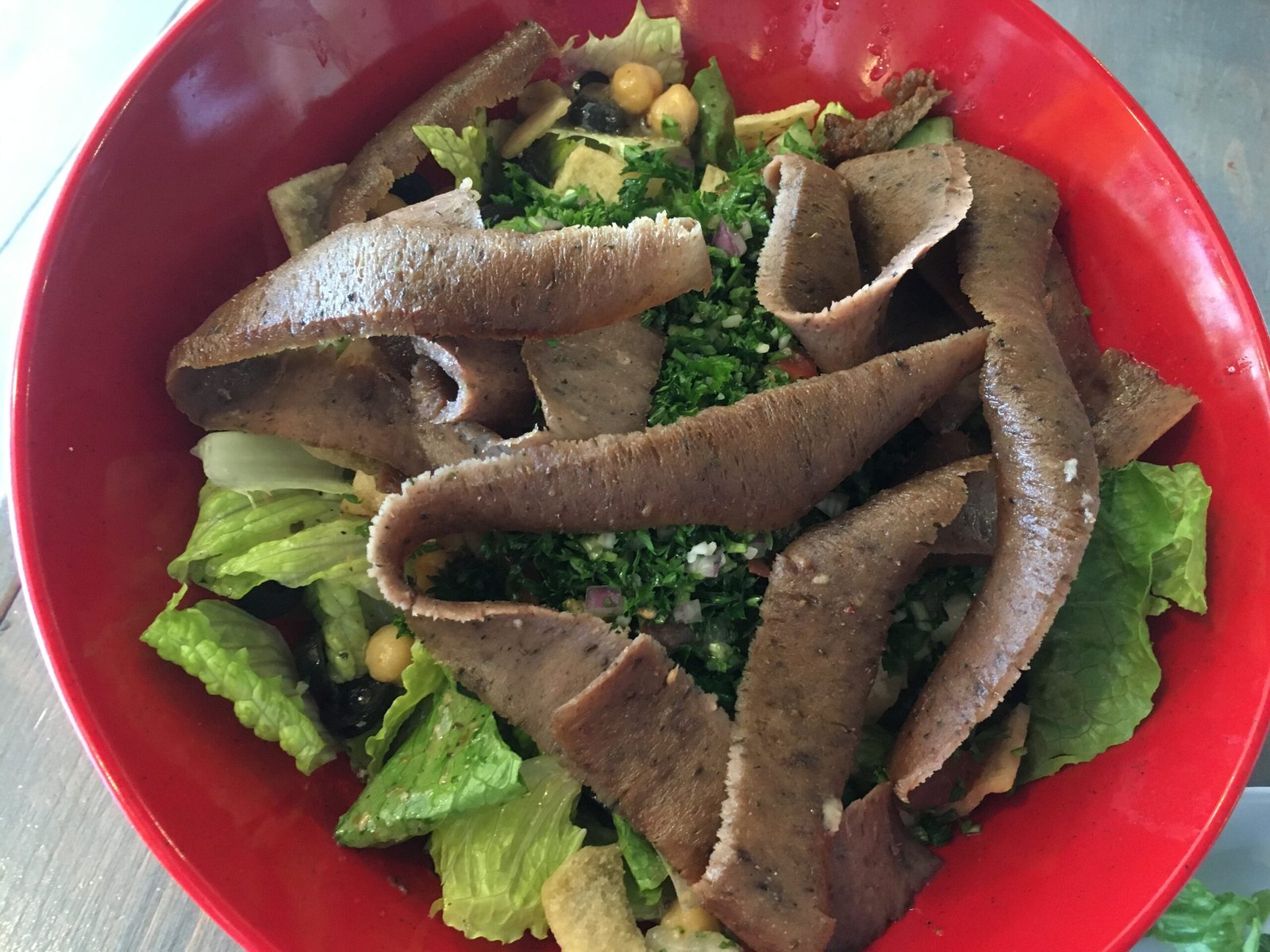 The Mediterranean salad ($6.25-make it a large, add $2.54=$8.79), add on gyros ($2.50) made a large, satisfying meal (the bowl is deep). The salad has chickpeas, olives, cucumber and a large topping of tabbouleh along with crispy pita chips. The addition of gyros filled out the bowl. Everything, again, was so very fresh.