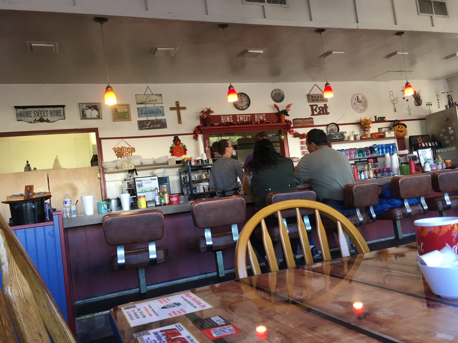 There's a 12 seat counter area and two rooms of tables. None of the coffee cups match, there are quirky signs (as well as anything with "Home Sweet Home" imprinted), the tables have advertising for neighboring businesses embedded in the tops (tables were made by a neighboring business). There is some holiday decor. I think we interacted with each of the friendly waitresses (who greet 'regulars' by their first name). A calm, familiar, cozy place.