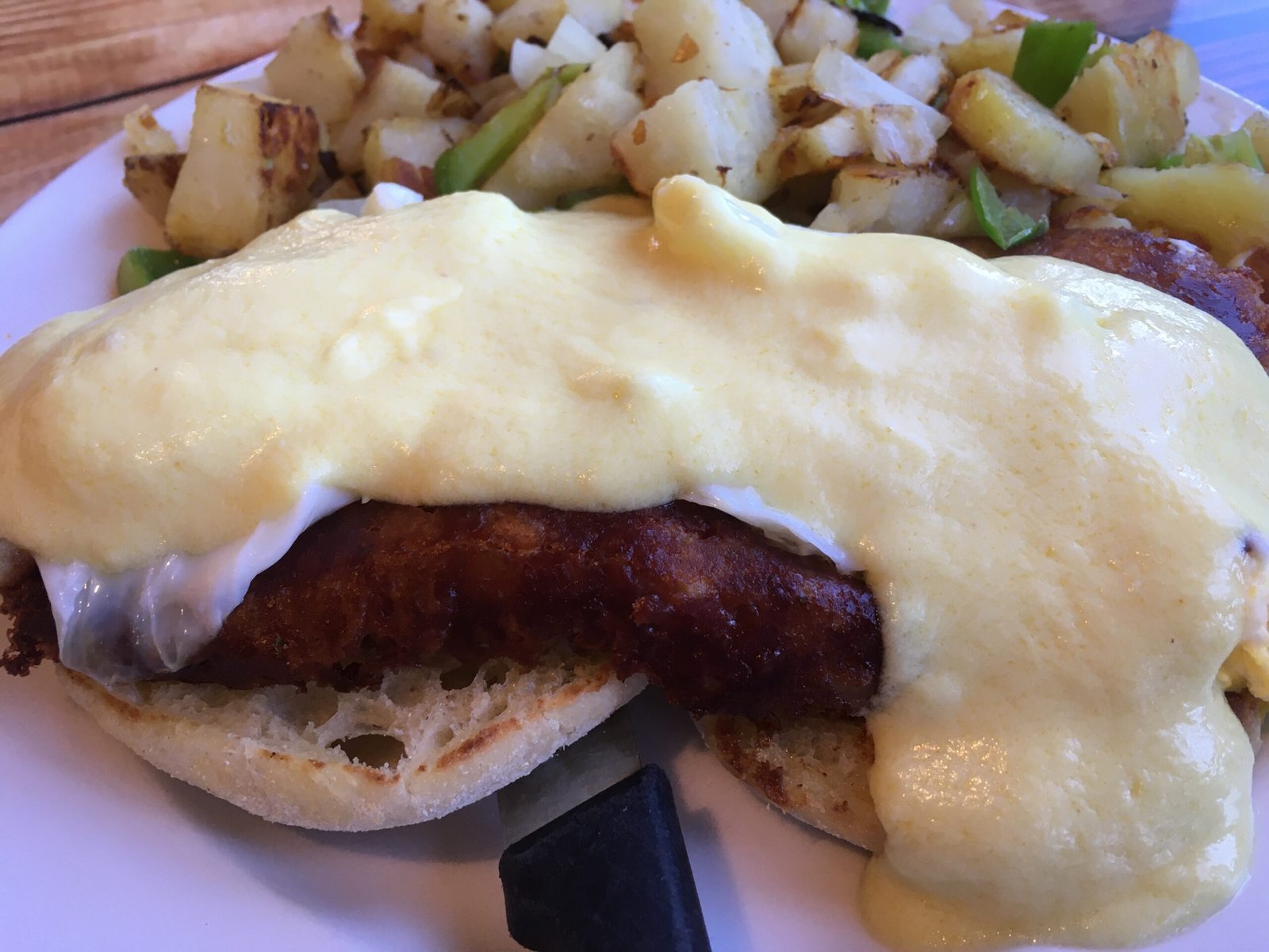 The Mister tried the "Devon" Benedict ($11.50)- corned beef hash topped with poached eggs topped with Hollandaise sauce, all on top of a toasted English muffin. He chose home fries on the side. Not fancy, but very good. The hash was plentiful, probably from a can (the diced potatoes were a bit too perfect), the Hollandaise was house made, but didn't have lemon in it (I notice stuff like that). The potatoes were fried to a crisp edge with creaminess in the center, along with the bell peppers and onions.