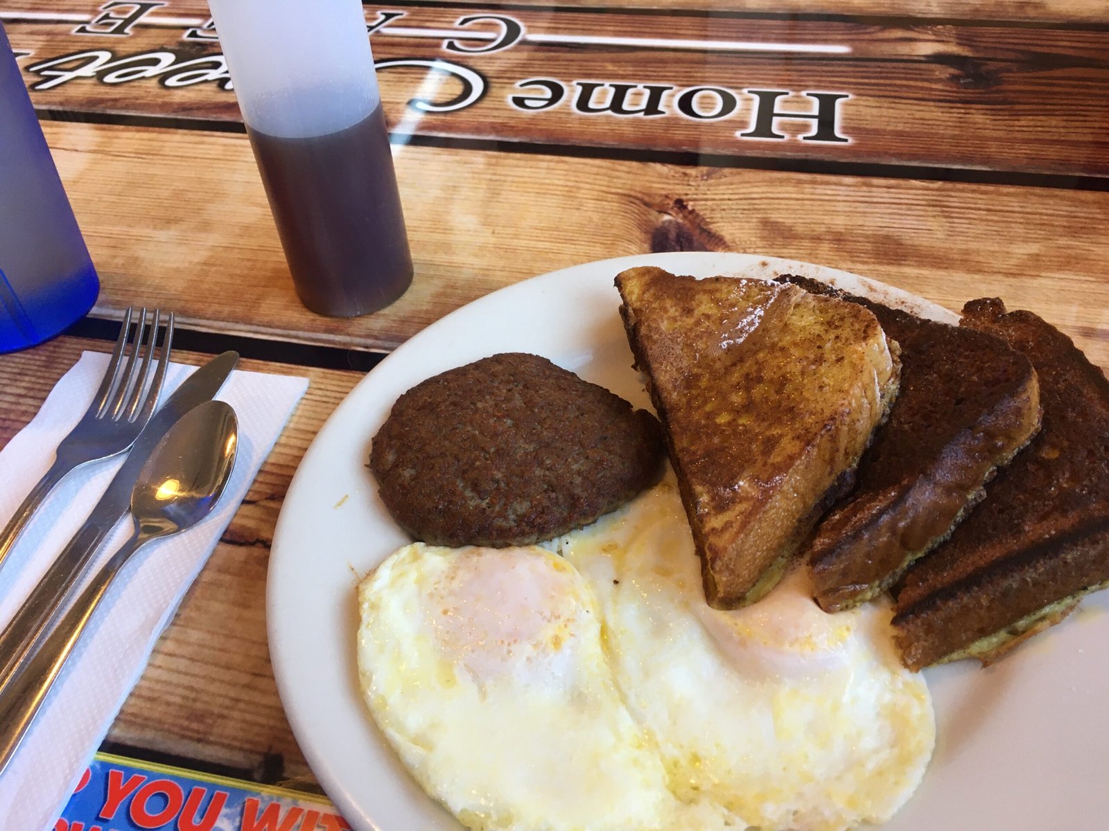 I decided to try the 'French Toast Special' ($11) with three halves of French toast. Ignore the color; it is not burned. I was asked if I wanted cinnamon on my toast and I asked for it to be on two of the three halves. The bread was eggy and soft on the inside with the exterior just the right amount of light crisp. The over-easy eggs were perfectly runny and I had a choice of bacon or sausage links or a sausage patty…oh yes, an excellent sausage patty.