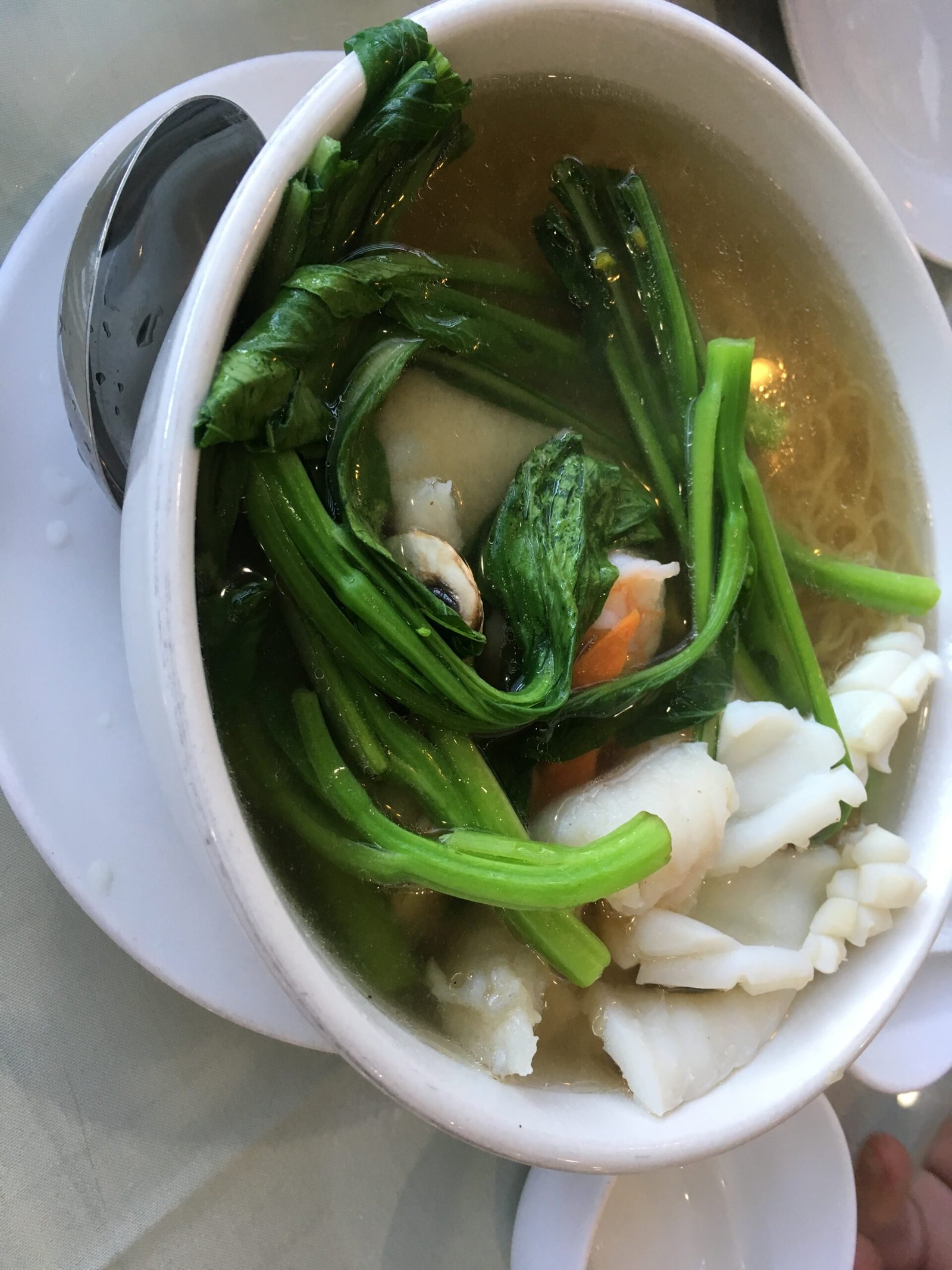 Filled with shrimp, squid and fish as well as bok choy, carrots and plenty of eggy noodles, this chicken-broth-based soup is satisfying on many levels. Of course the flavors as well as textures and freshness make this a very satisfying meal on its own.