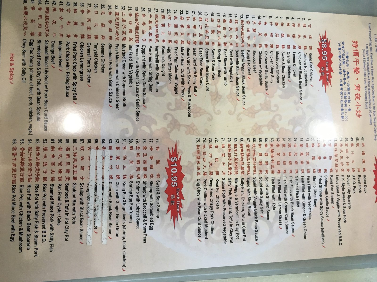 Kung Pao Three ingredients ($10.95) is not too spicy. There are chilis and onion stir fried with the beef, chicken and shrimp. The peanuts mixed in help 'neutralize' any real spiciness you might encounter. Again, a mix of flavors (you can taste each ingredient) and textures and just a satisfying meal.