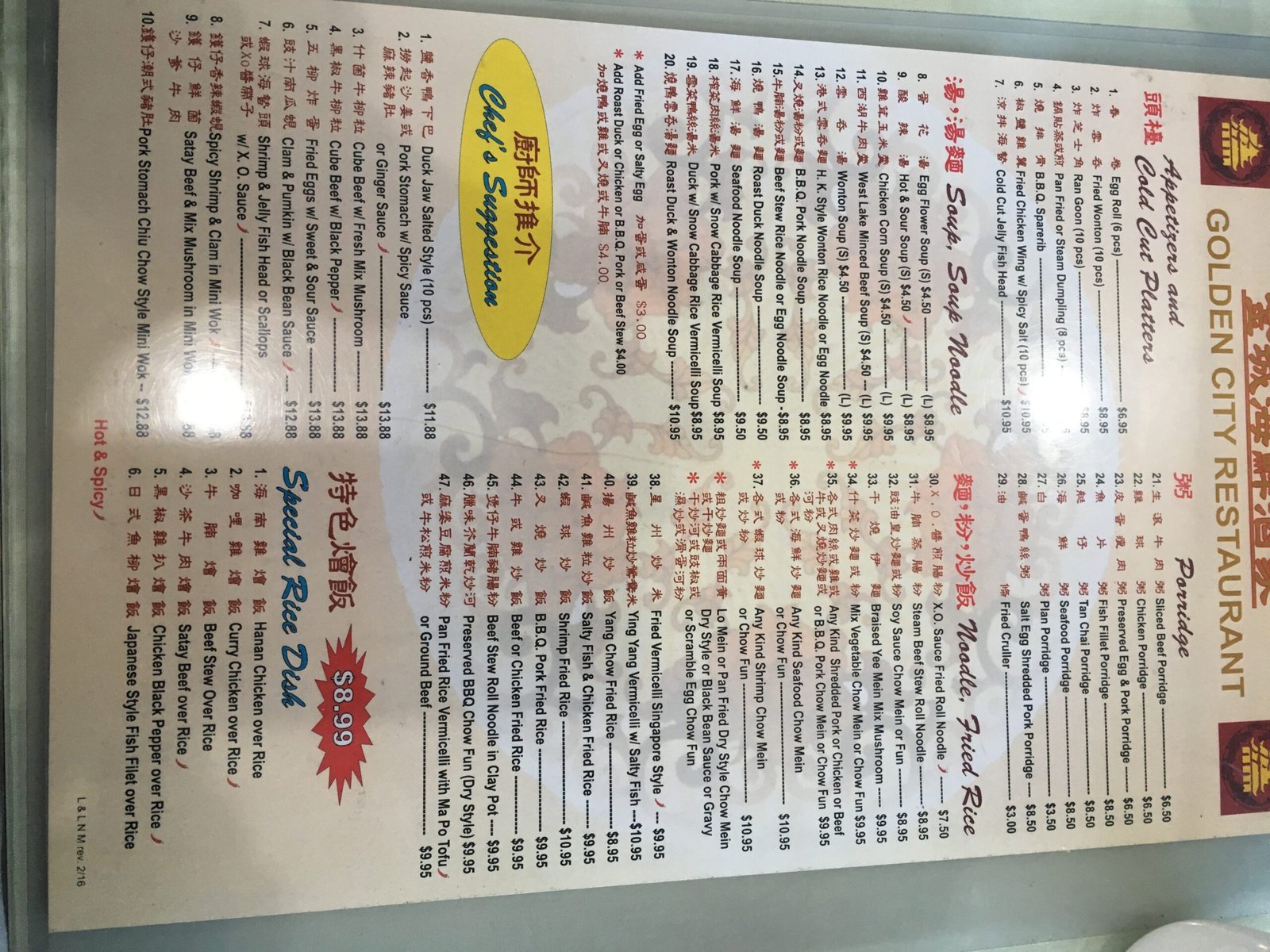 Golden City Chinese Cuisine 5375 Kearny Villa Road San Diego, CA 92123 (858) 565-6682 open Mon-Th 11 a.m.-11 p.m., Fri-Sat-Sun 11 a.m.-midnight
