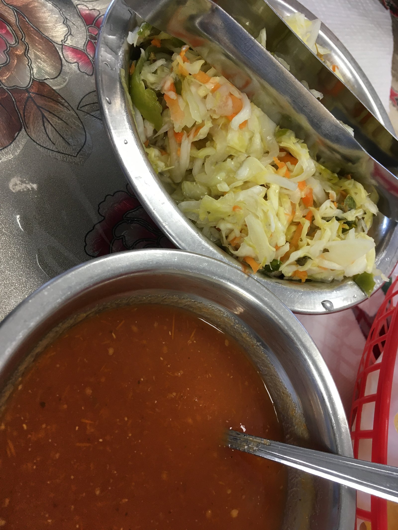 What wonderful, fresh, filling and large/heavy pupusas! Such fresh flavors! A wonderful meal by themselves. The accompanying fresh made curtido and tomato sauce were very complimentary to all the flavors. The curtido was so fresh, with the cabbage, carrots, Mexican oregano and just enough jalapeño with a light fermentation that we did finish the bowl brought out, some of it with food and some of it just plain.
