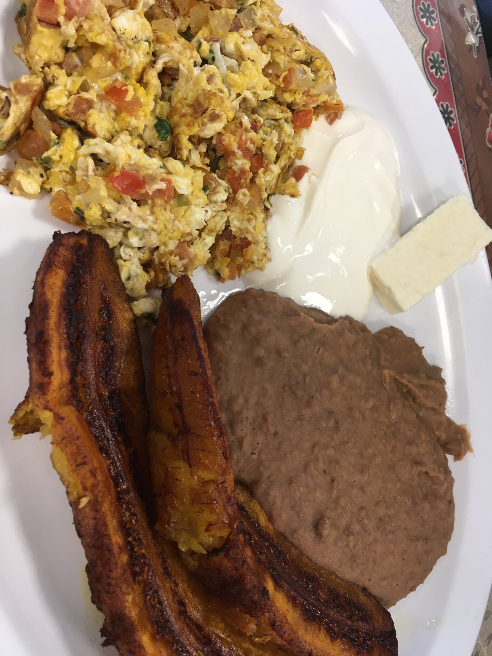 There were several 'Breakfasts' on the for here menu and the choice of plantains with creama and beans or plantains with eggs looked interesting. Plantains with beans, crema, a piece of cheese and eggs scrambled with a fresh house made salsa turned out to be the order ($9.99) (we were not asked how to have the eggs prepared). The fried plantains with just a bit of the crema were sweet and hearty. The refried beans (not black beans like in the pupusa) were wonderful. The scrambled eggs with the tomatoes, onion and cilantro, were really good, with flavor in every bite.