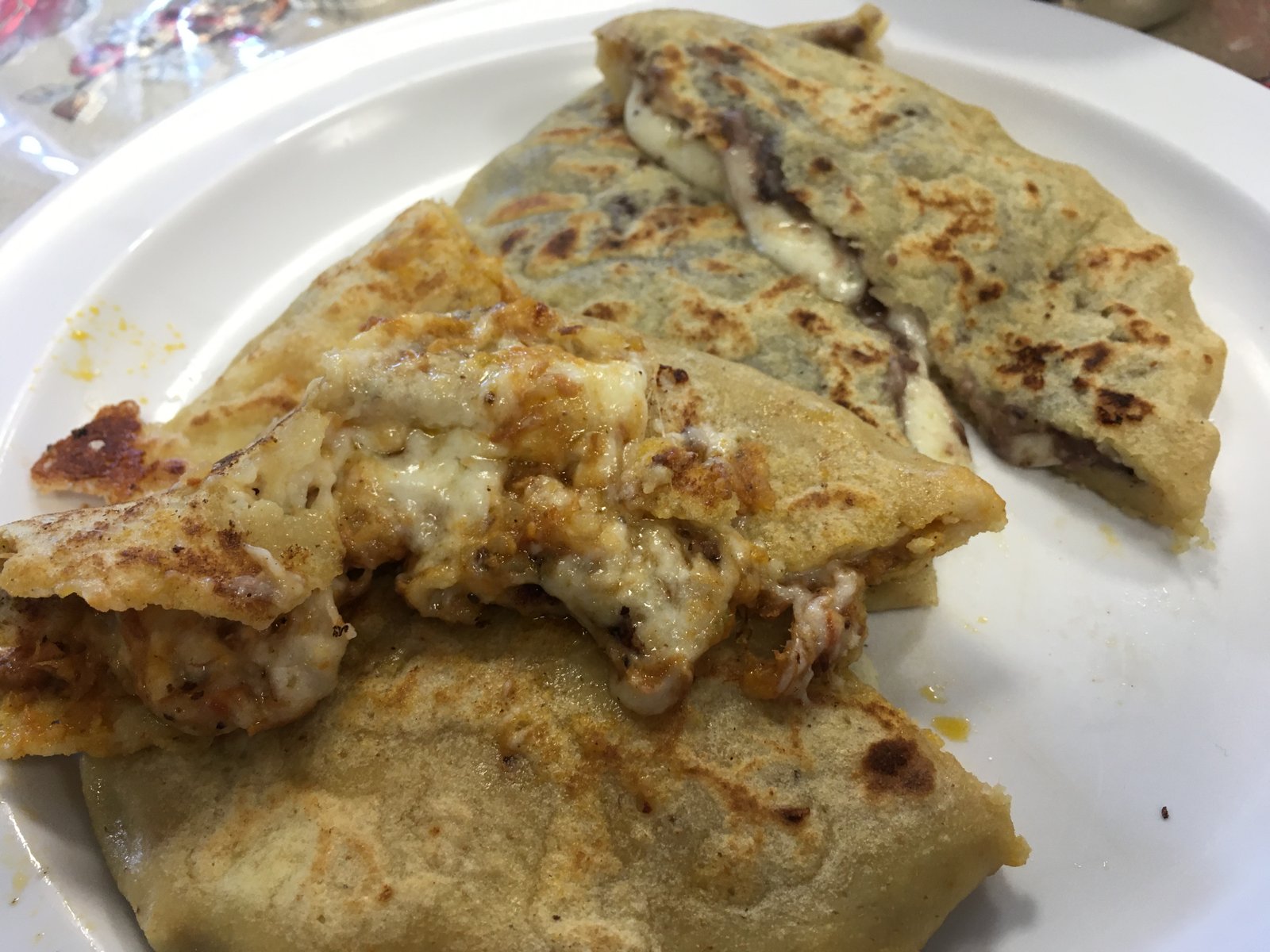 Since this is a Pupuseria, I ordered two ($2.25 each). There are ten flavors on the menu. You can hear the dough being slapped in the kitchen when preparing the order. The one in front is chicharron with cheese, the other one is bean and cheese- black beans with cheese.