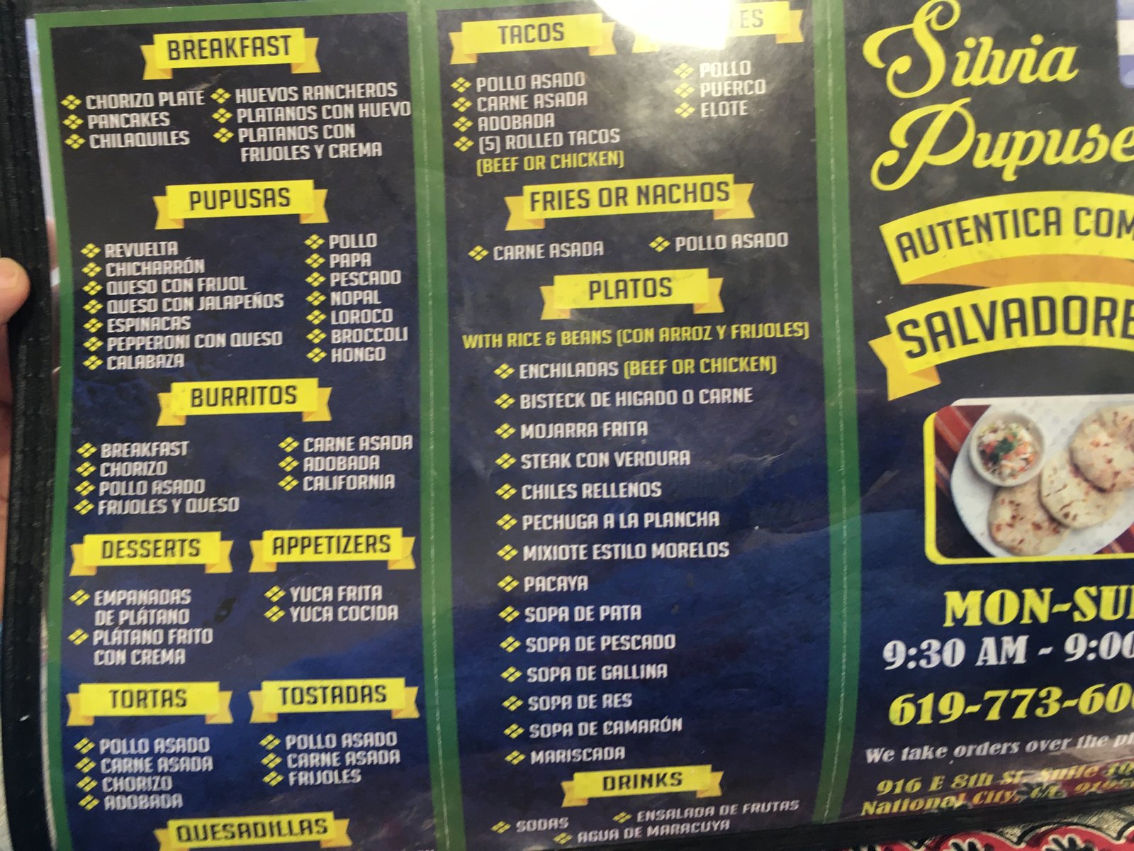 Silvia's Pupuseria 916 East Eighth Street, Suit 106 National City, CA 91950 (619)534-2037 Open Daily 9:30 a.m.- 9 p.m.
