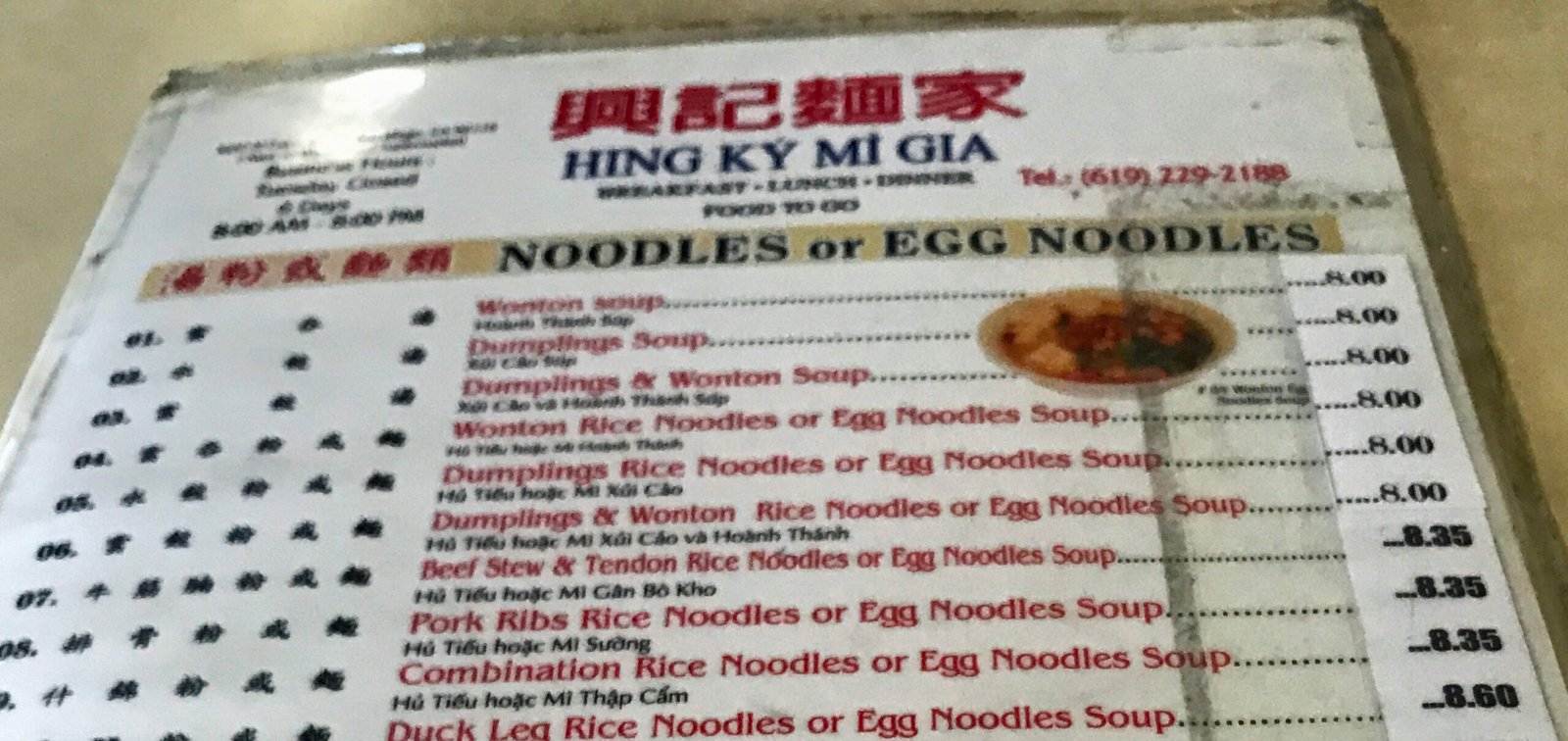 For my next "noodling around" post, I decided to start on ECB and move West from 54th. The first place from there is the discreetly located Tan Ky Mi Gia; which used to be Hinh Ky Mi Gia, which used to be Tan Ky Mi Gia….if you're keeping score. The menu still says Hinh Ky Mi Gia……