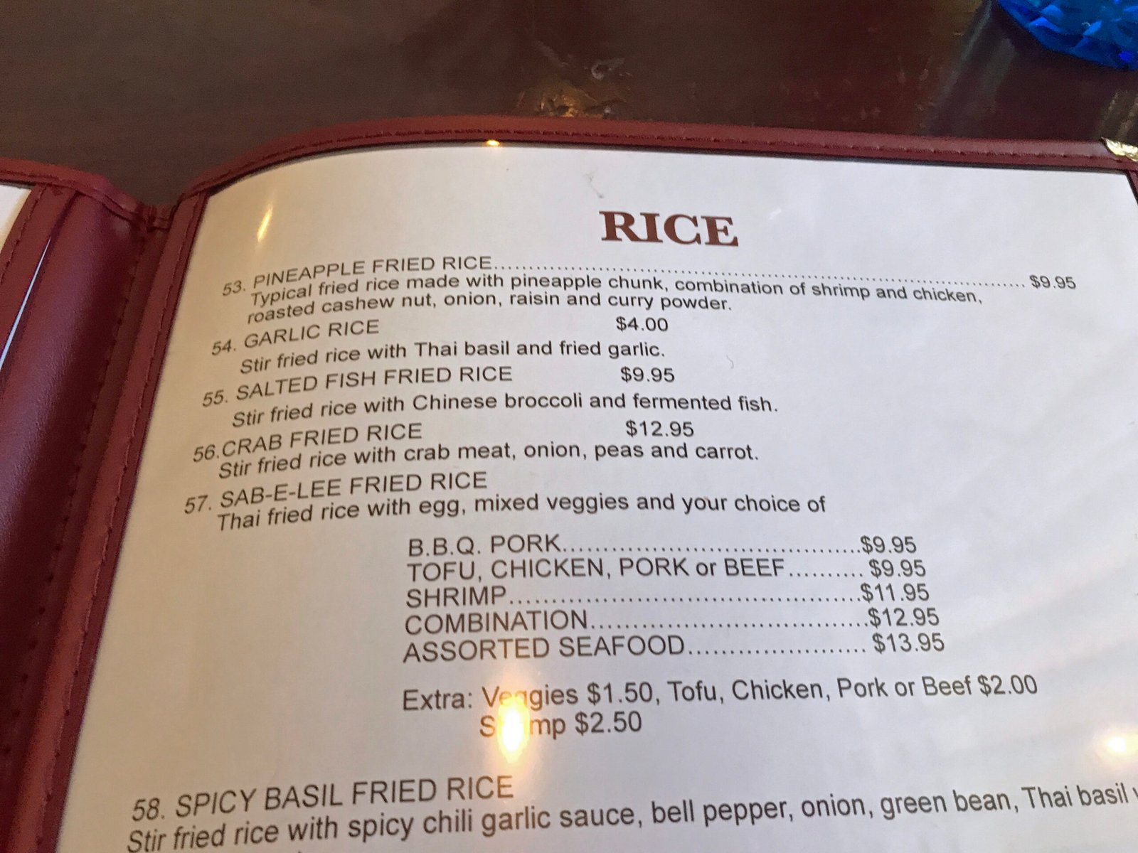 Some of them used to be favorites of ours…….Sab E Lee was one of them right from they opened in 2008. Over the years, they've opened a location in PQ, moved the original shop to a larger location down the street, and opened another, more Thai comfort food based restaurant in the old location. And of course, there's the Sab E Lee location in Santee, which I used to call SEL2. The original owner of TOSEL sold the place to the cooks and opened up a location in Santee back in 2009. The food wasn't truly Issan like TOSEL, but some of the dishes were quite good. I looked at my post from 2012 and realized I hadn't been back there in over 7 years! Also, the Missus has been wanting Salted Fish Fried Rice; something that TOSEL and Thai Papaya took off their menu a few years back. Looking at the online menu for the place; I noticed that they still had it on the menu…..in Santee! I hoped.