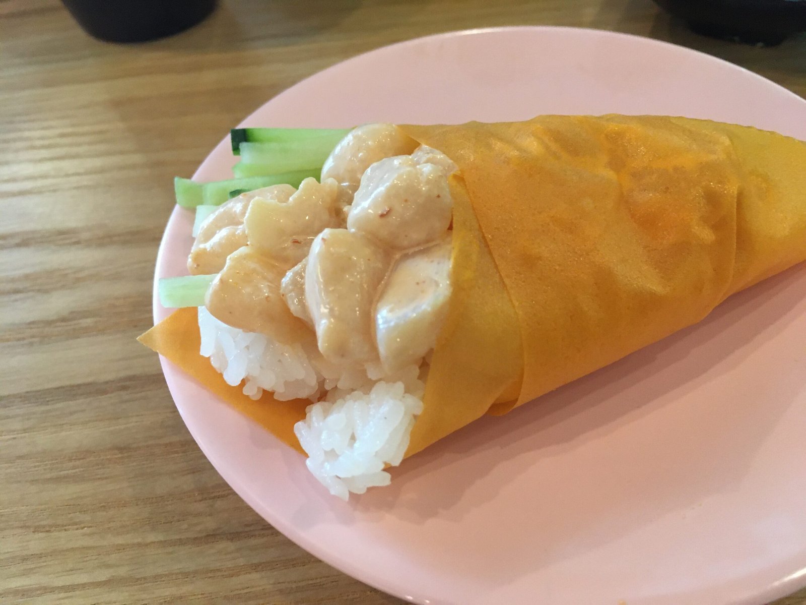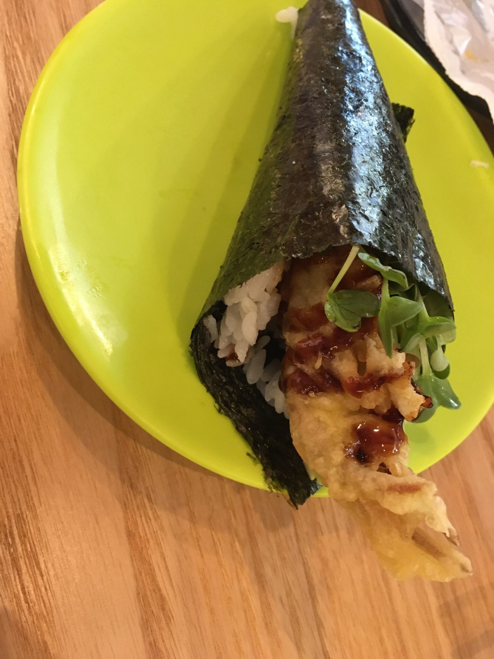 The soy wrapped spicy scallop hand roll (also $2.80) was wonderful and also much larger than expected. I would much rather have this than three smaller spicy scallop rolls from the conveyor for the same price.