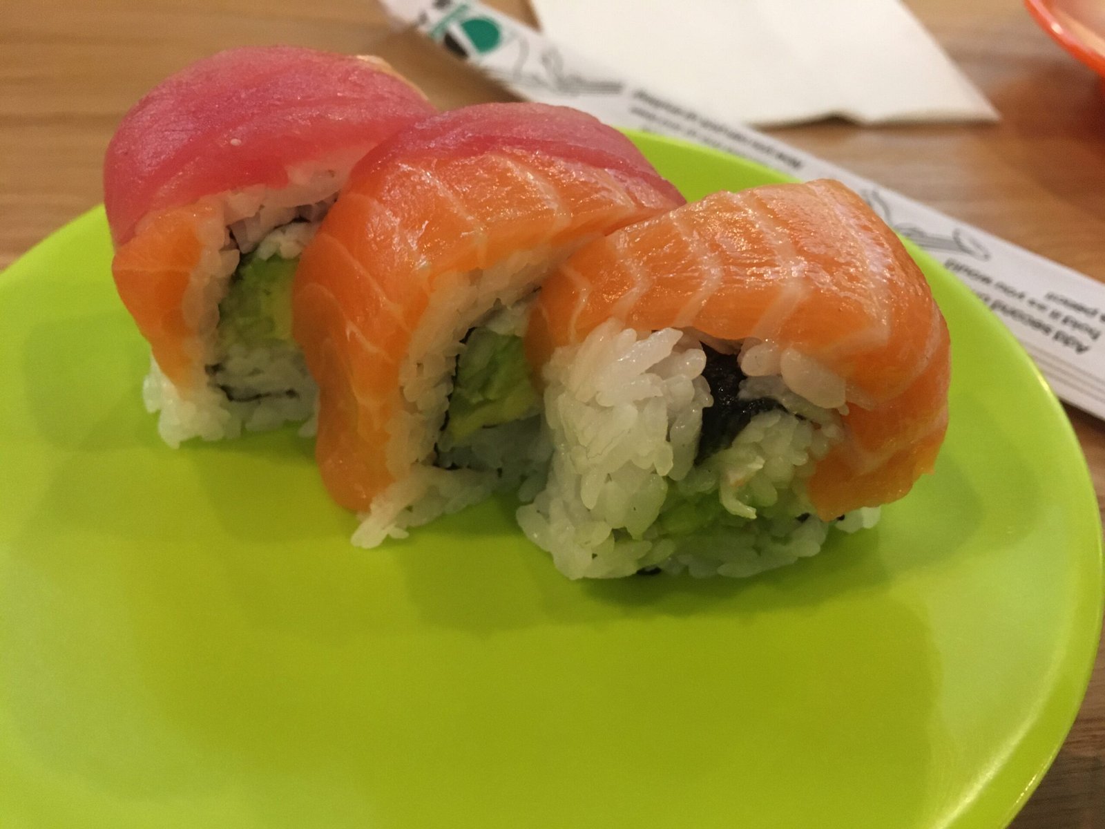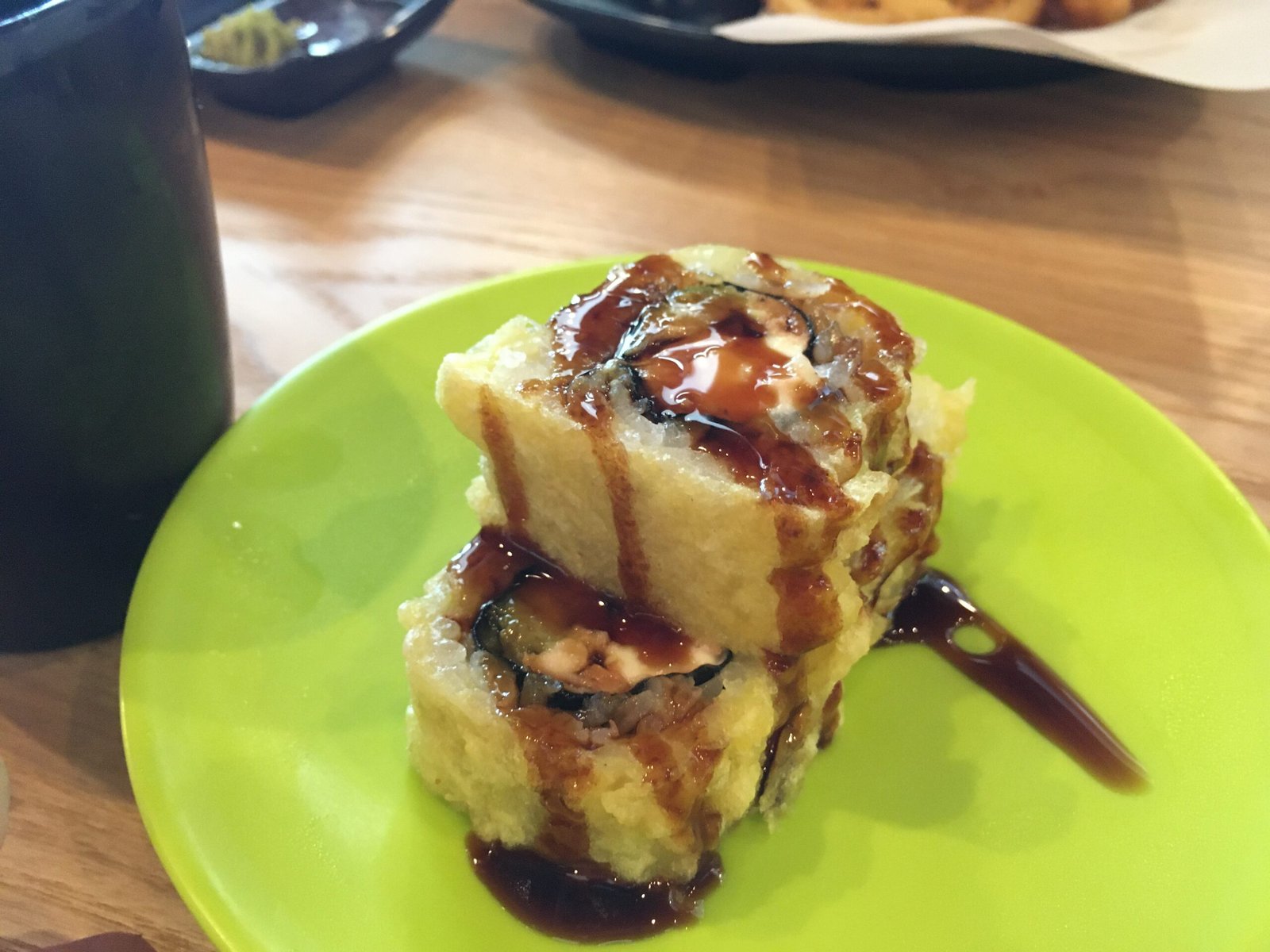 We got all wild and crazy and chose a 'Las Vegas Roll' from the rolling belt. The breaded fried roll had a filling including real crab and cream cheese. It was fresh and tasty.
