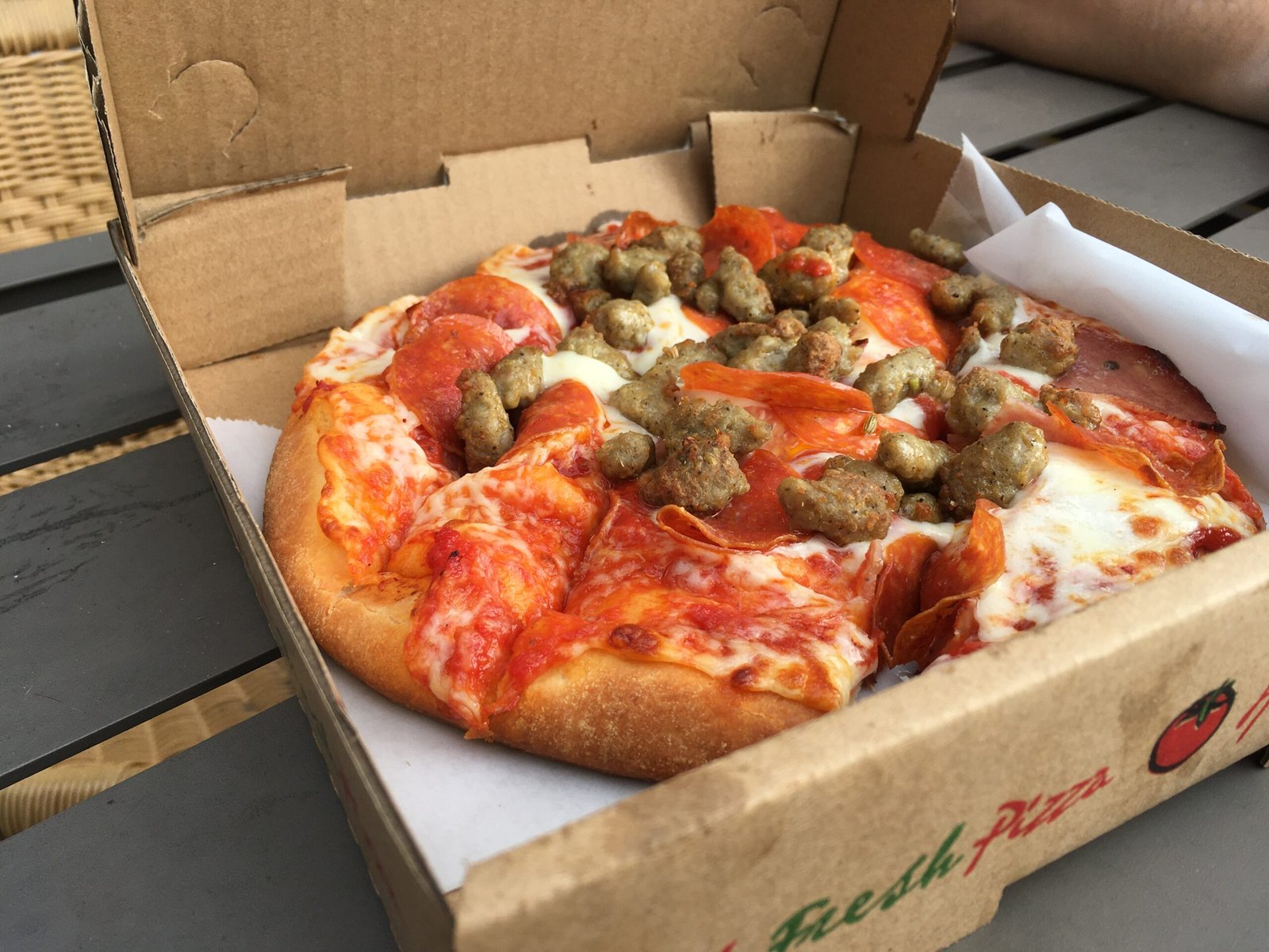 The "personal size" pizza is quite large, cut into six slices and has a wonderful crust! All pizzas are priced the same, $6.49. This, the 'Meat Lovers', includes pepperoni, sausage, salami and mozzarella. The sauce is a good tomato flavored unadorned deliciousness.