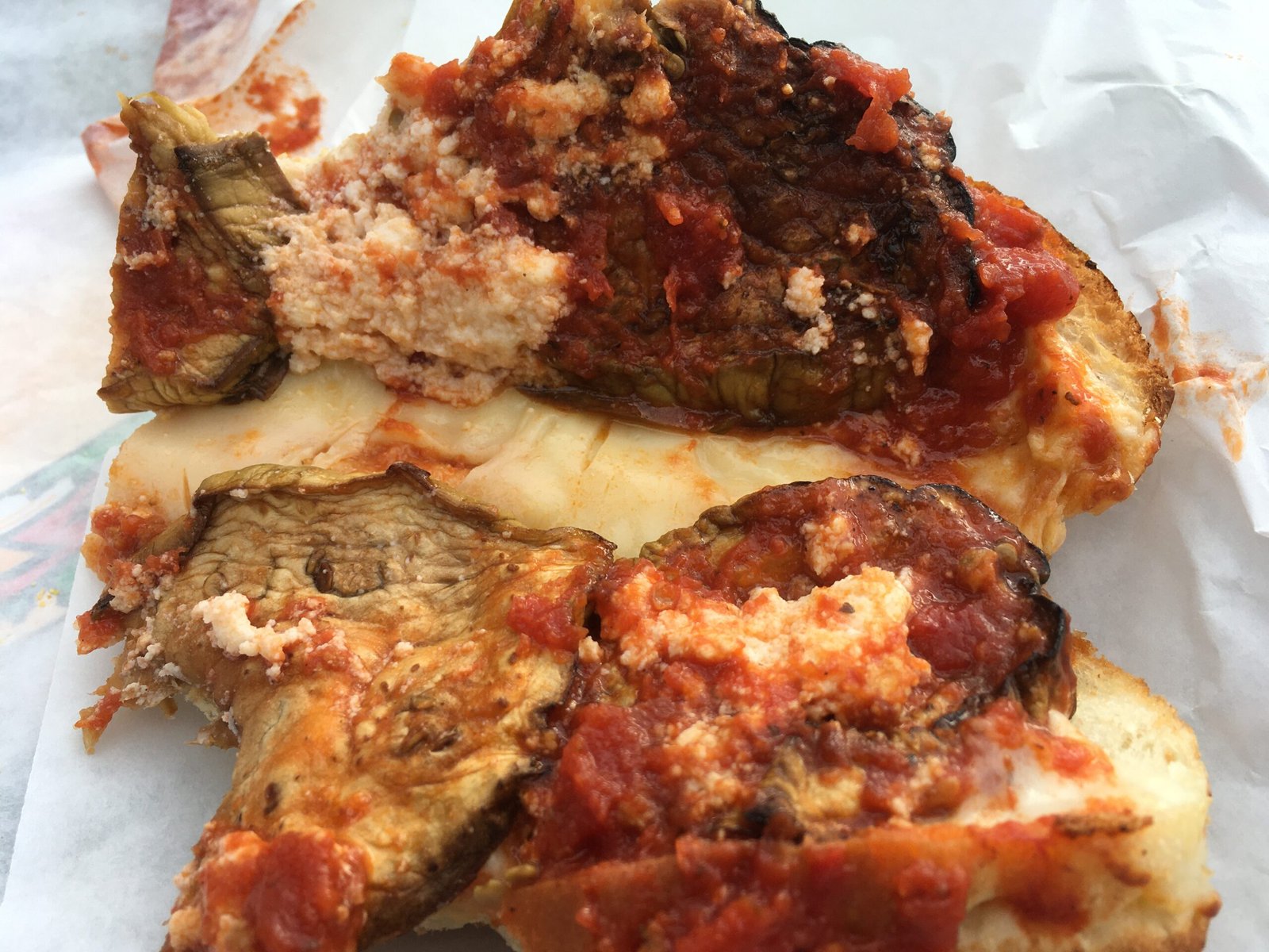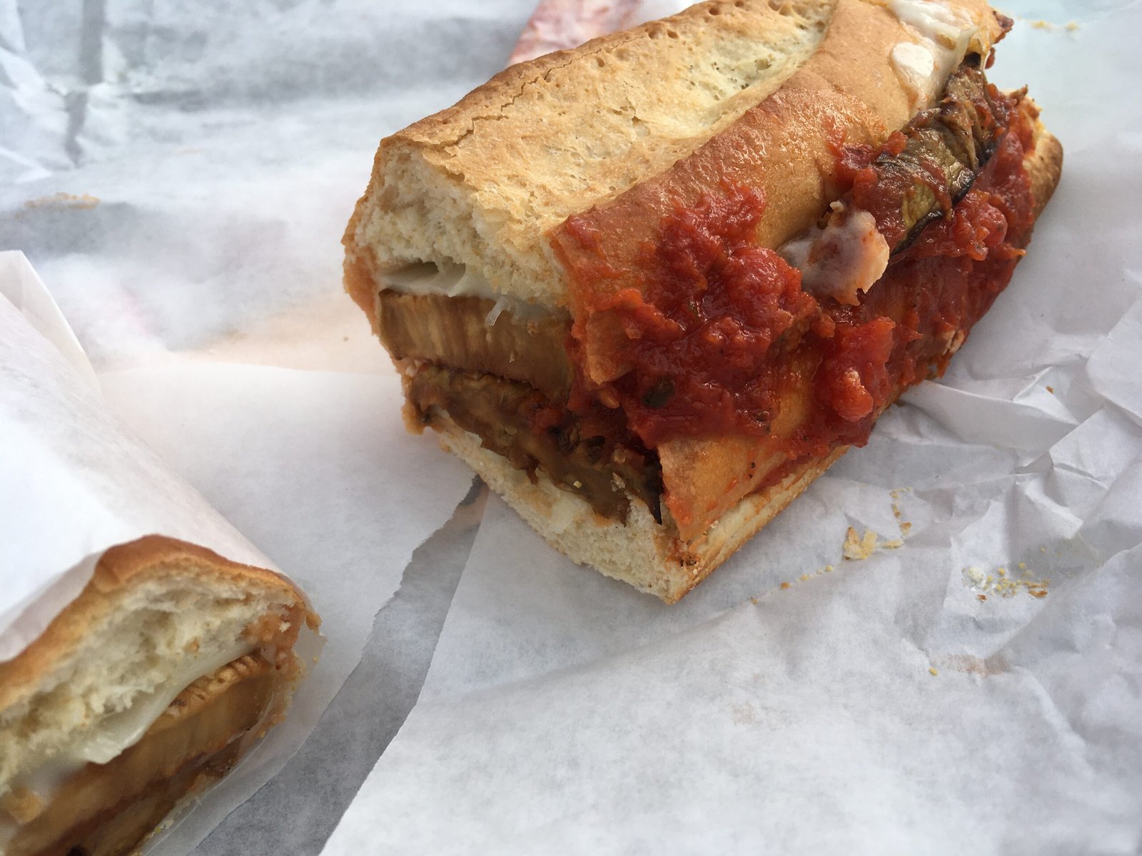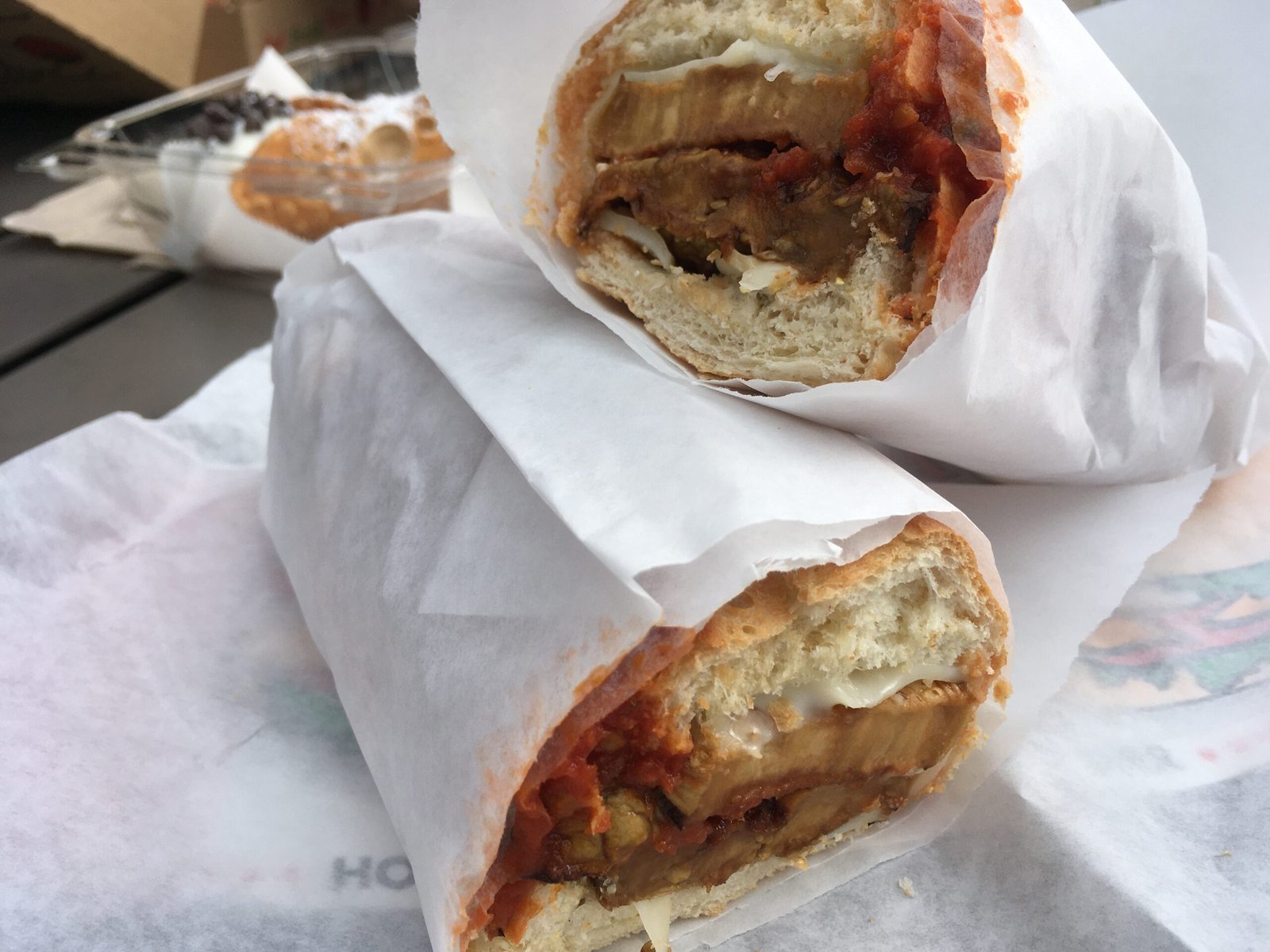 The Baked eggplant sandwich, listed under 'Favorite Subs' ($8.99) is simple with eggplant baked in olive oil, mozzarella and the simple yet flavorful tomato marinara. The sandwich/bread baked here is quite large and half of a sandwich (on the wonderfully tasty toasted bread) is filling. There appeared to be some ricotta on the sandwich also…which made it even better.