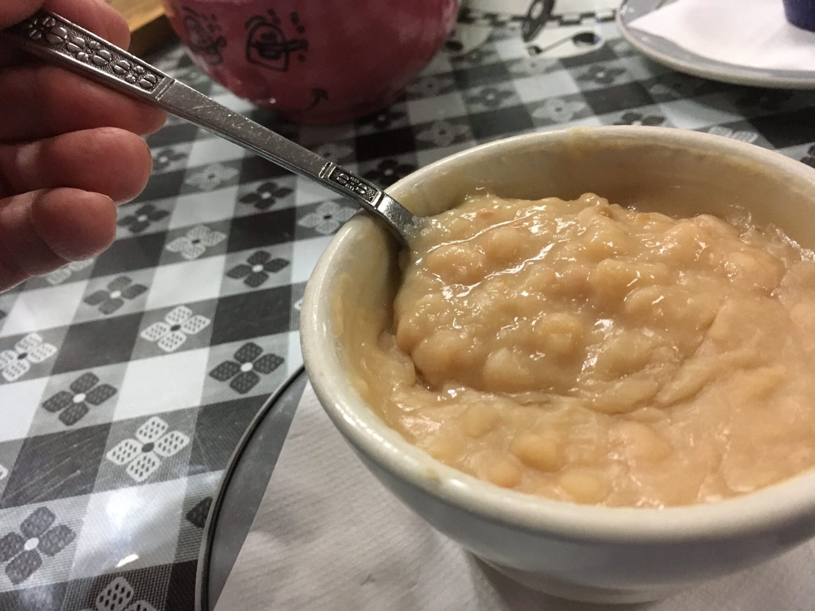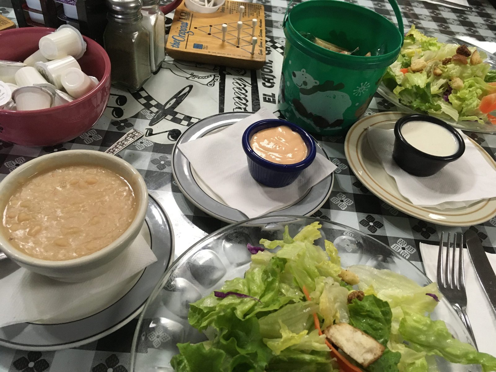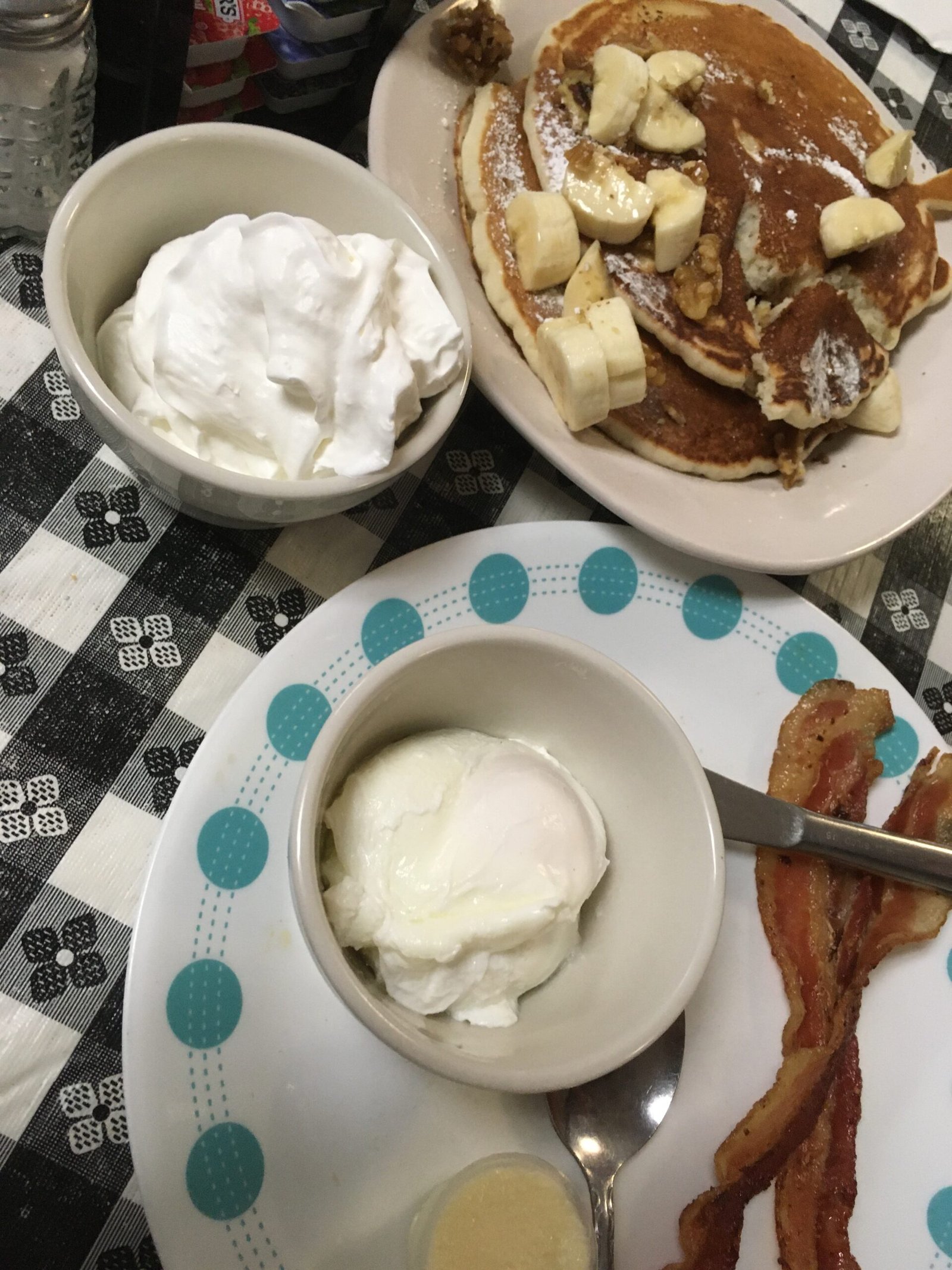 There are white boards with Specials listed at both doors (there is a large parking lot next door (opposite the Veterinary Hospital side) with a back entrance next to the Tatoo Parlor). This was the order of banana walnut pancakes ($6.95) add bacon and eggs ($3.25). The fluffy with crisp-edged, buttermilk cakes were wonderfully flavored-and even better topped with the fresh bananas and walnuts. The eggs were perfectly poached and the bacon added a good salty bite. Yes, that's some 'would you also like some whipped cream?' in the soup cup.