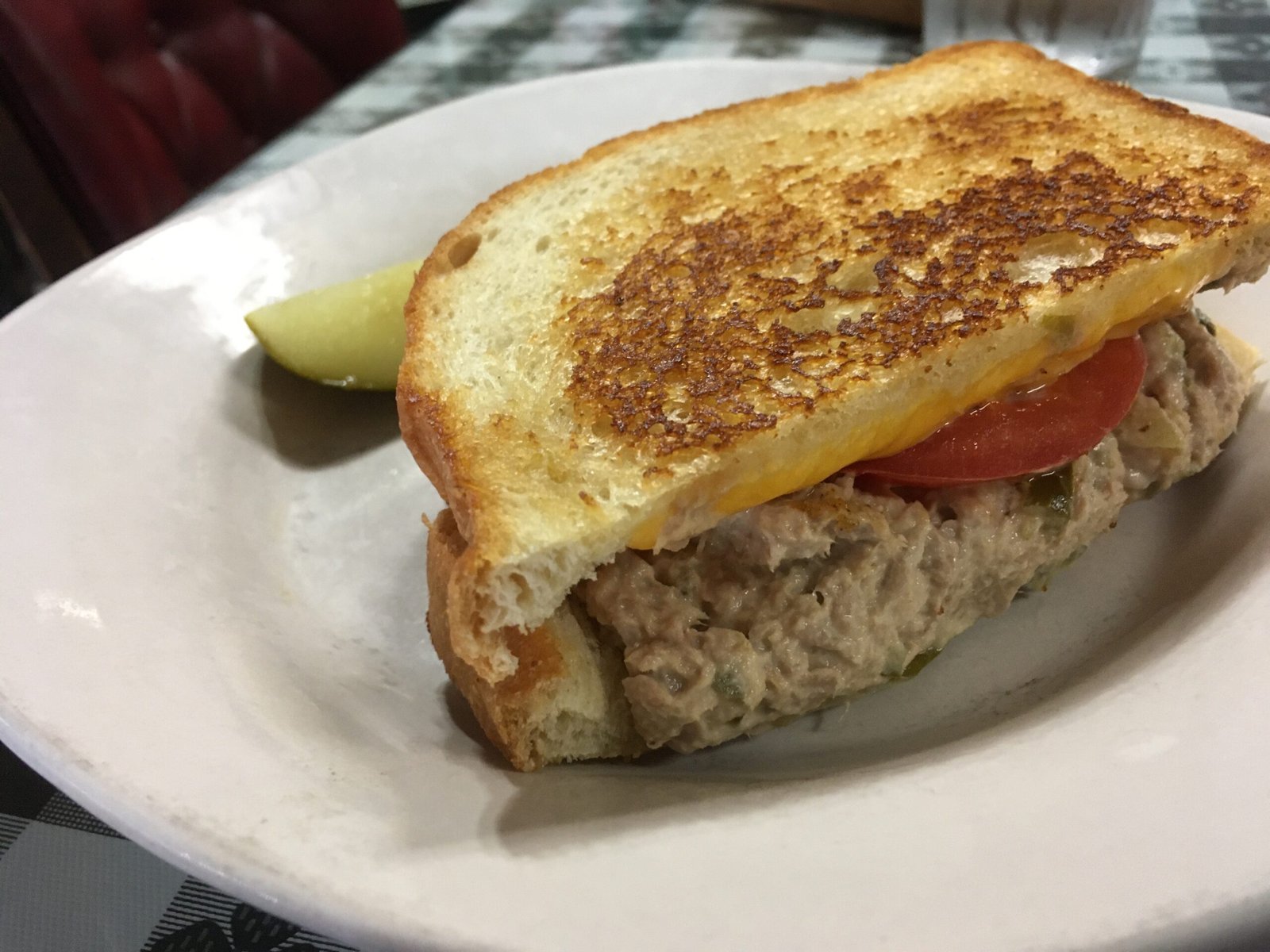 The tuna salad sandwich is made on grilled sourdough bread with American Cheese and a tomato. The tuna salad itself is simple and made with sweet relish. The dill pickle along with the sour, crispy, buttery grilled bread added the right amount of salty to the meal.