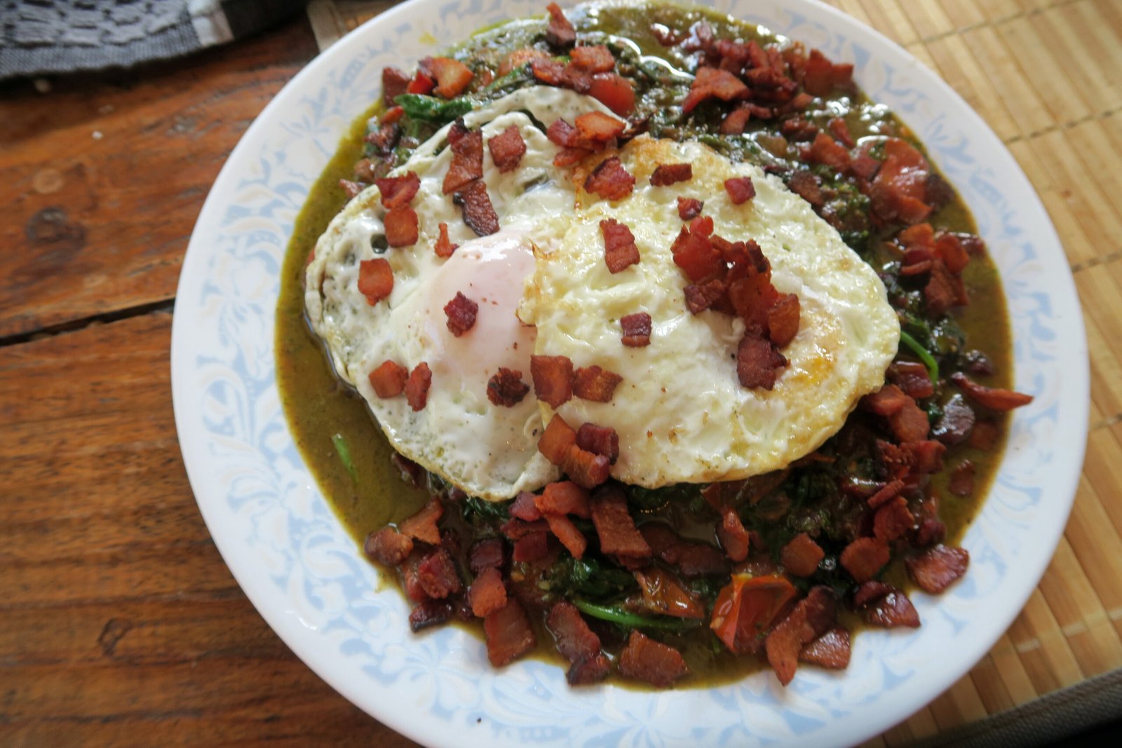 Not all inspiration come from far away….we recently had a nice brunch at Tribute Pizza (post is coming up) and the Missus wanted me to make something in the same vein. Which ended up being Kale and Chard with Lardons in Pesto….with lots of sauce for bread.