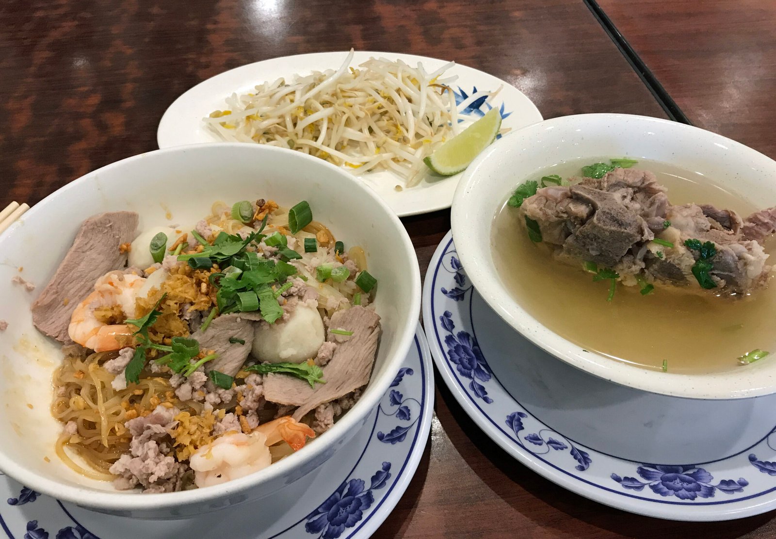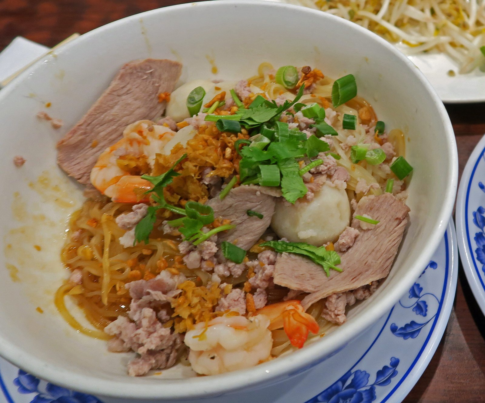 And the one woman who works here always remembers me; even though I don't drop by quite as often these days. She smiled and told me "Happy New Year" as I sat and was handed the menu. And while I do on occasion order different items…..well, this is a "Noodling Around" post; so I stuck with my usual, the Hu Tieu Nam Vang ("Phnom Penh Noodles") Kho ("Dry"). I know; I did a comparison post just a few months back. Still, I was quite interested in how the Hu Tieu Nam Vang was going to be; while it was pretty good on my last two visits, I'd had a not so great version there several visits back.