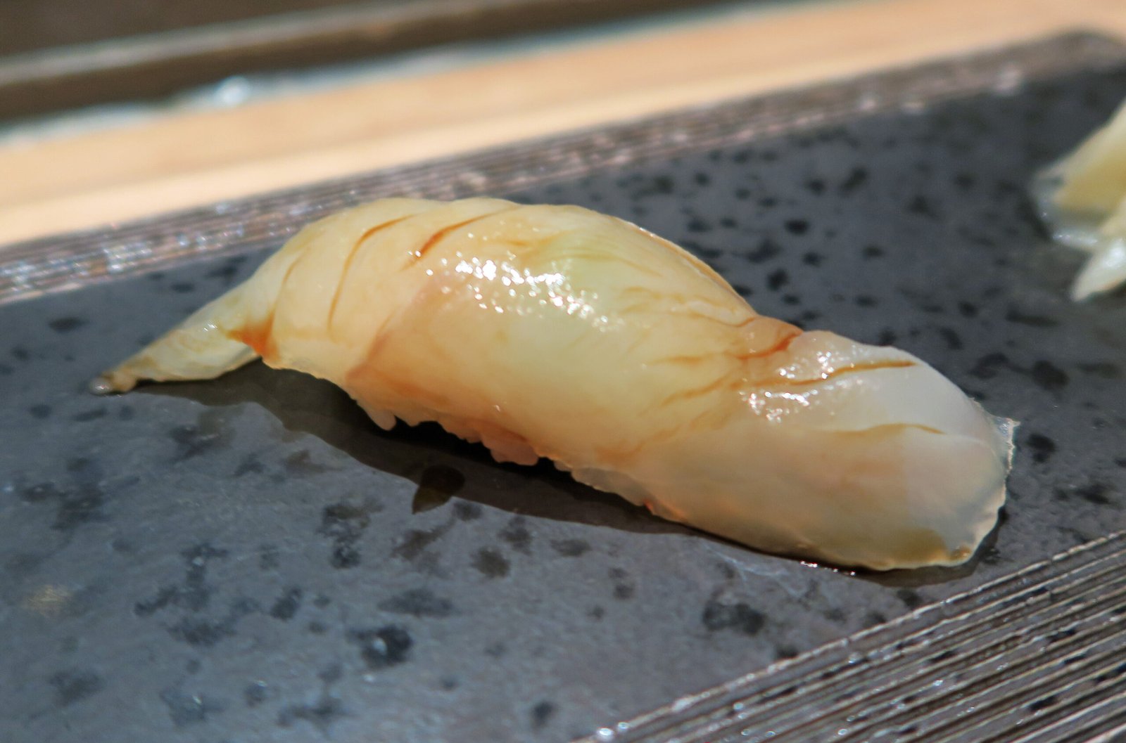 This was prepped perfectly, the mild savory tones enhanced by a touch of ginger and scallion. Still, that texture was quite surprising. Take-san told me this Aji was line caught "Ougon Aji", which makes a lot of difference.
