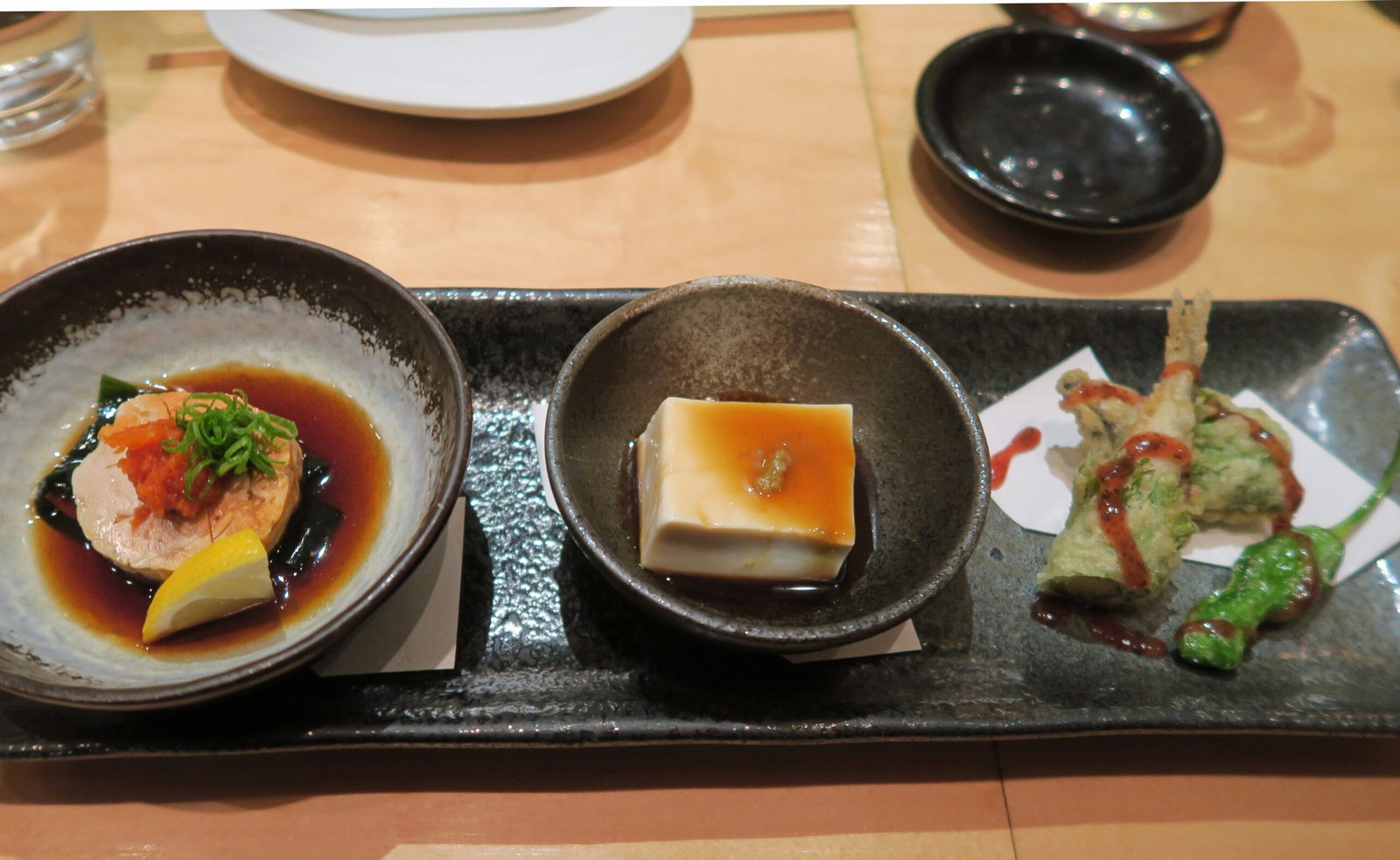 From right to left; a perfectly fried, meaty Shishamo (smelt) wrapped in shiso which added that nice herbaceous almost mint life flavor, the crisp tempura batter adding texture, the wonderful reduction contributing a nice acidity and a mild spice to really balance things out. In the middle was what I thought perhaps might be goma tofu; but I was told it was "Yuba"…..it was so smooth and creamy, amazingly beany.