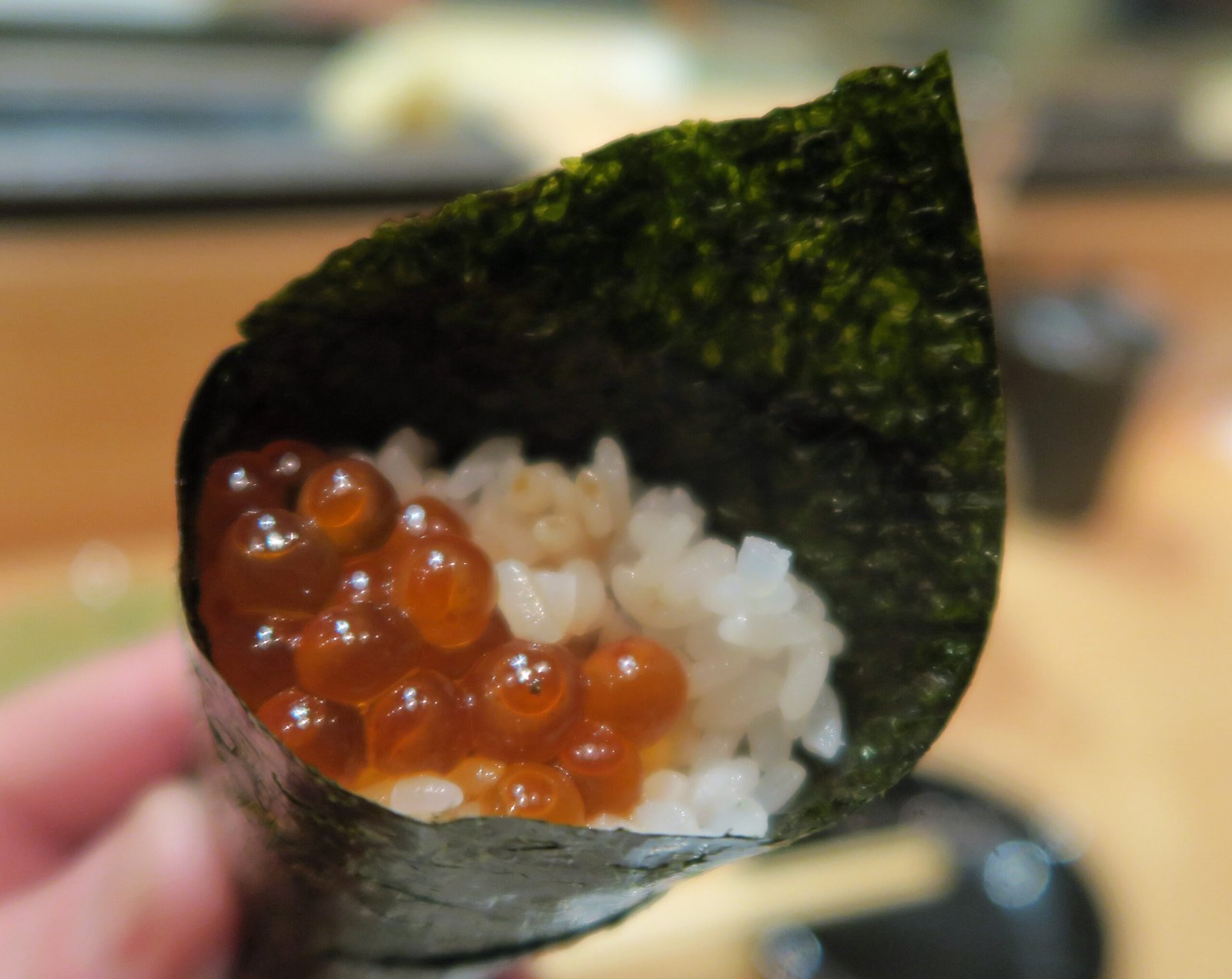 By this time, the Missus and I had thrown in the towel….we were perfectly satisfied. But Take-san asked if he could make one more item for us. He brought out a package of nori and made us an Ikura Hand Roll……the amazing thing about this wasn't the ikura, nor the perfectly seasoned rice, but the nori. It was crisp, like it had been toasted, there was a smokiness to it.