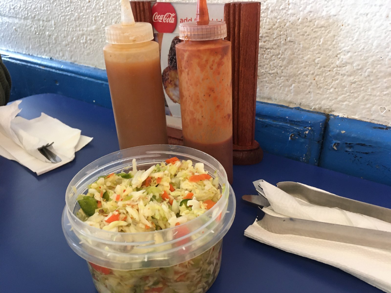 Freshly prepared curtido is brought to the table when you order pupusas. Also, a plain tomato sauce is an accompaniment. There is a house made a chili based hot sauce (usually used with the Mexican side of the menu) which I requested.