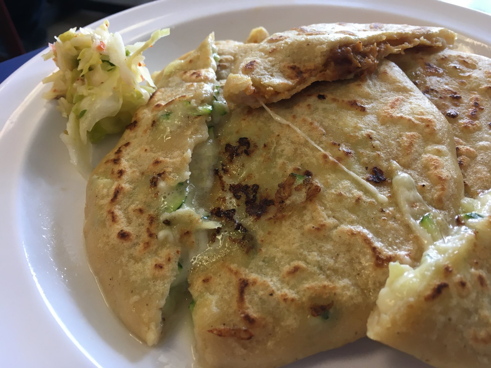 A cross section photo of the stuffed dough doesn't quite do it justice. The calabaza (zucchini squash) with cheese was light and refreshing. The revuleta (beans, cheese and chicharron) was almost too 'bacon-y' in flavor.