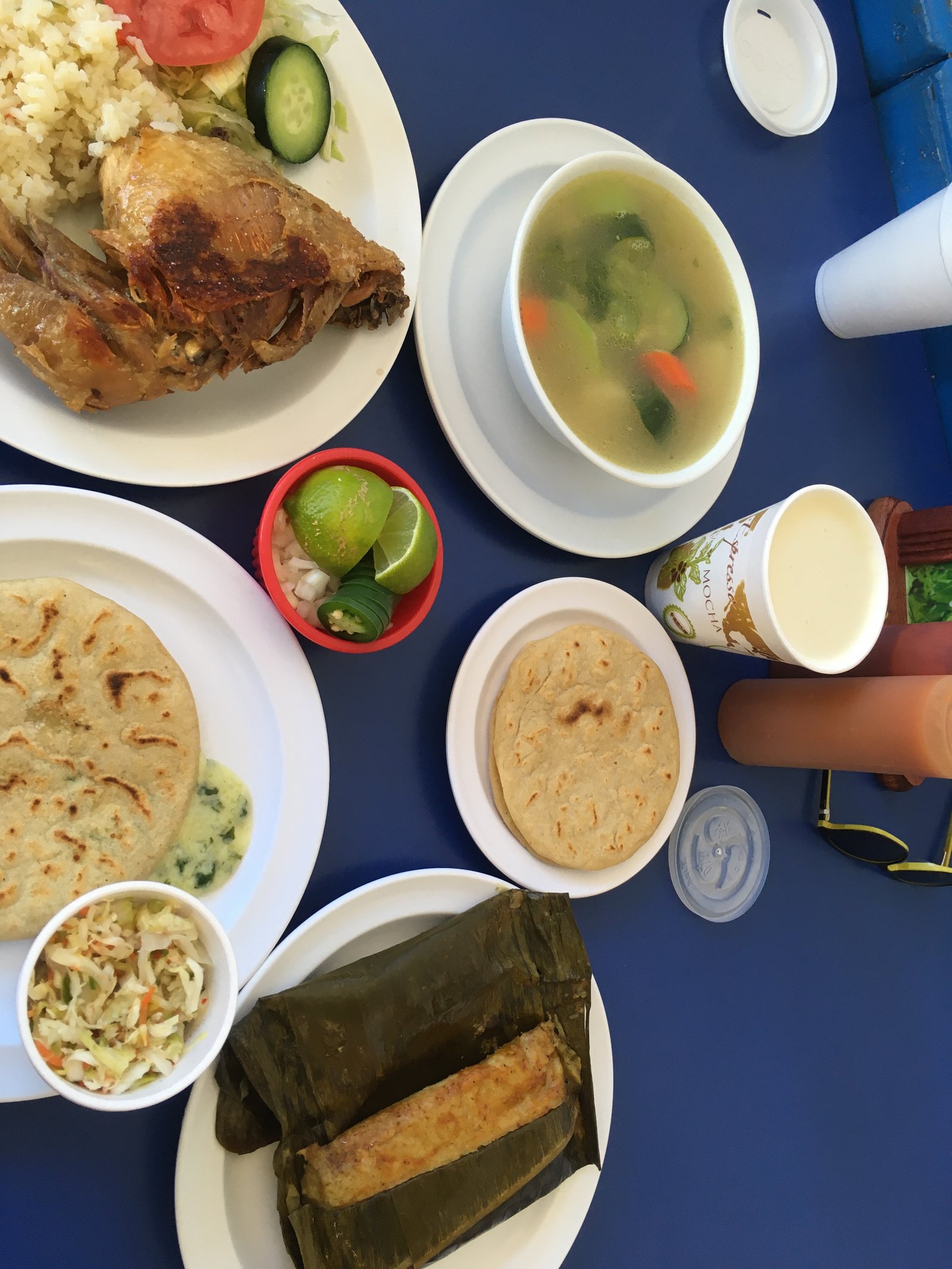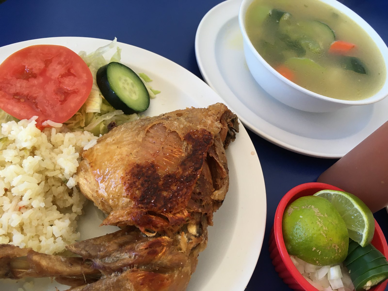 There are photographs of meals on the walls. The Mister and I pointed to one and ordered it. Chicken soup ($8.99) which arrived with this wonderfully fried quarter of a chicken on the side, a bowl of rich chicken broth filled with vegetables and the sides of rice and salad (and tortillas) as well as onion, jalapeño and lime wedges. After eating the chicken skin and trying some of the vegetable filled broth, shredded chicken was added to the soup and gave the meal another great flavor combination. We will order this again.