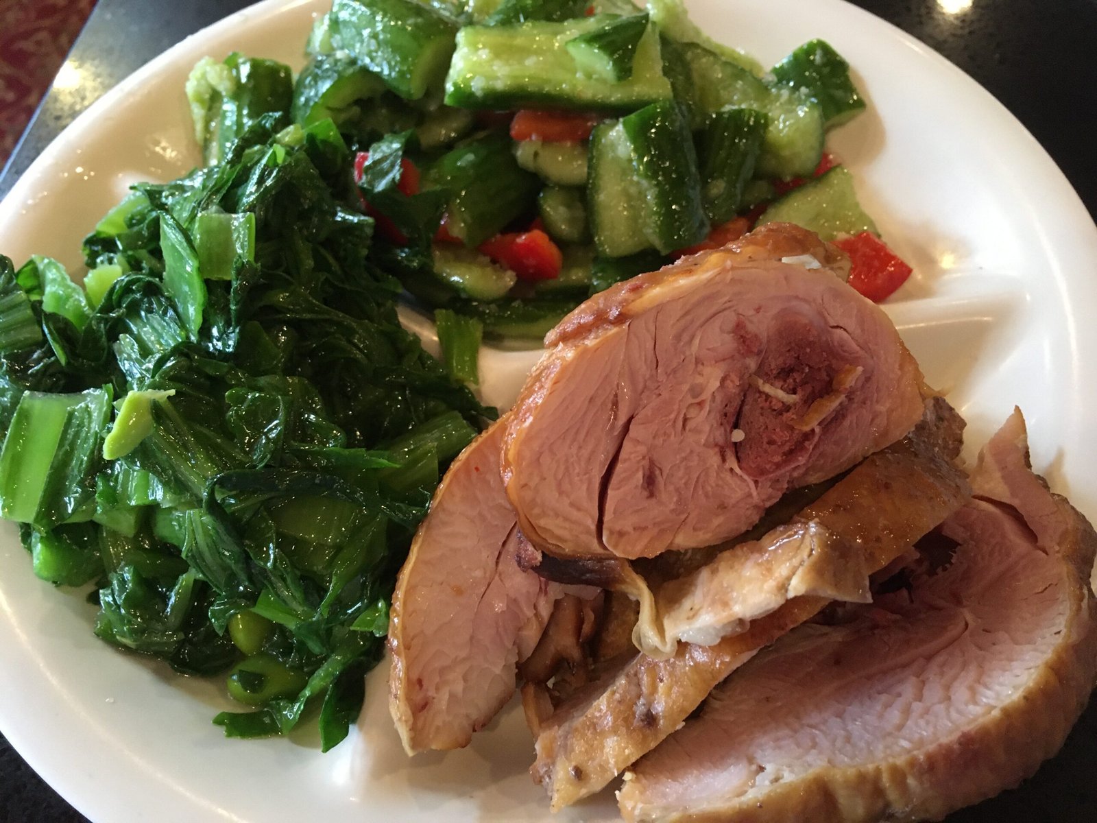 We choose items which might 'cool down' some of the spicier meal selections: Smoked chicken, (sesame oil) mustard greens and smacked (garlic-y) cucumbers.