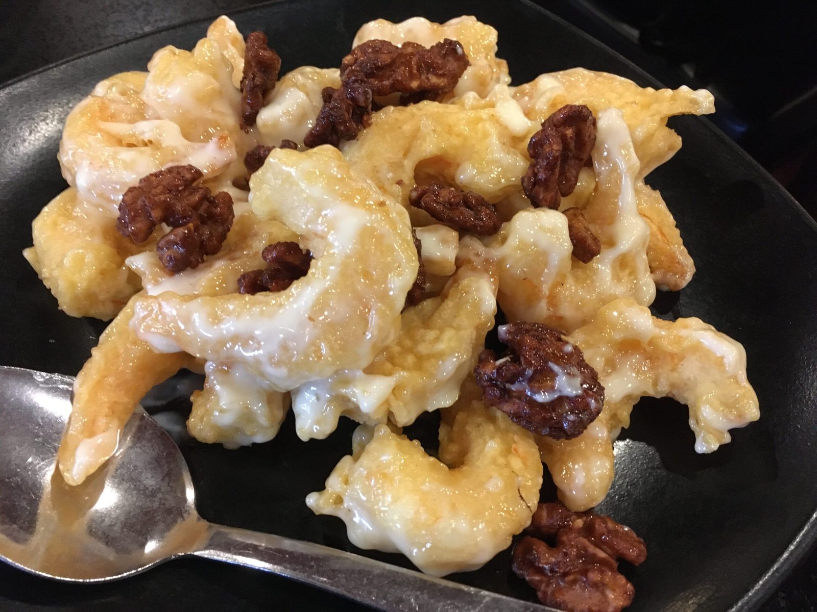 The walnut shrimp ($14.99) order is substantial, fresh made, with large shrimp having a crispy coating, mayonnaise based sauce and sweet, crispy walnuts throughout. Not spicy; very tasty.