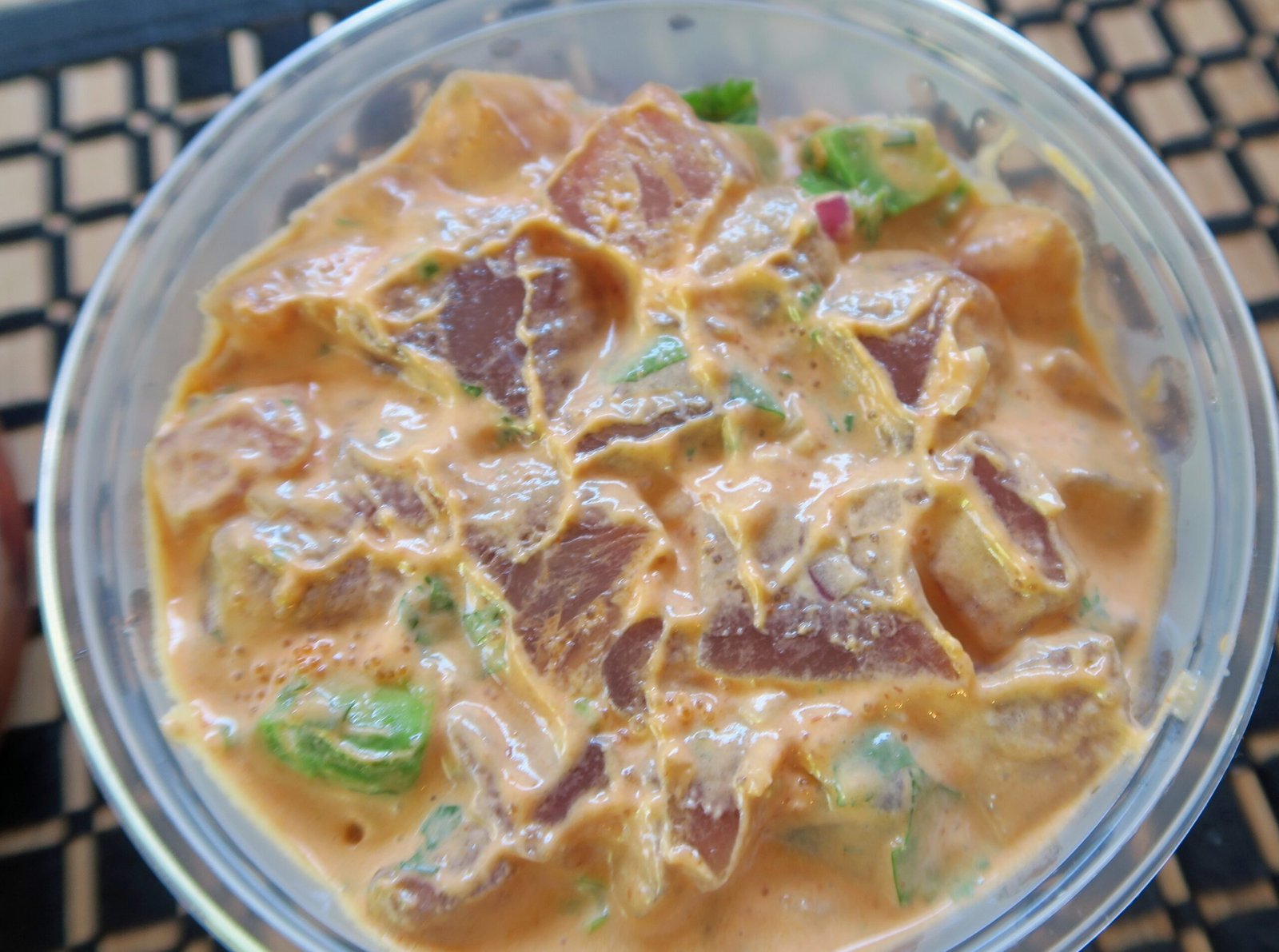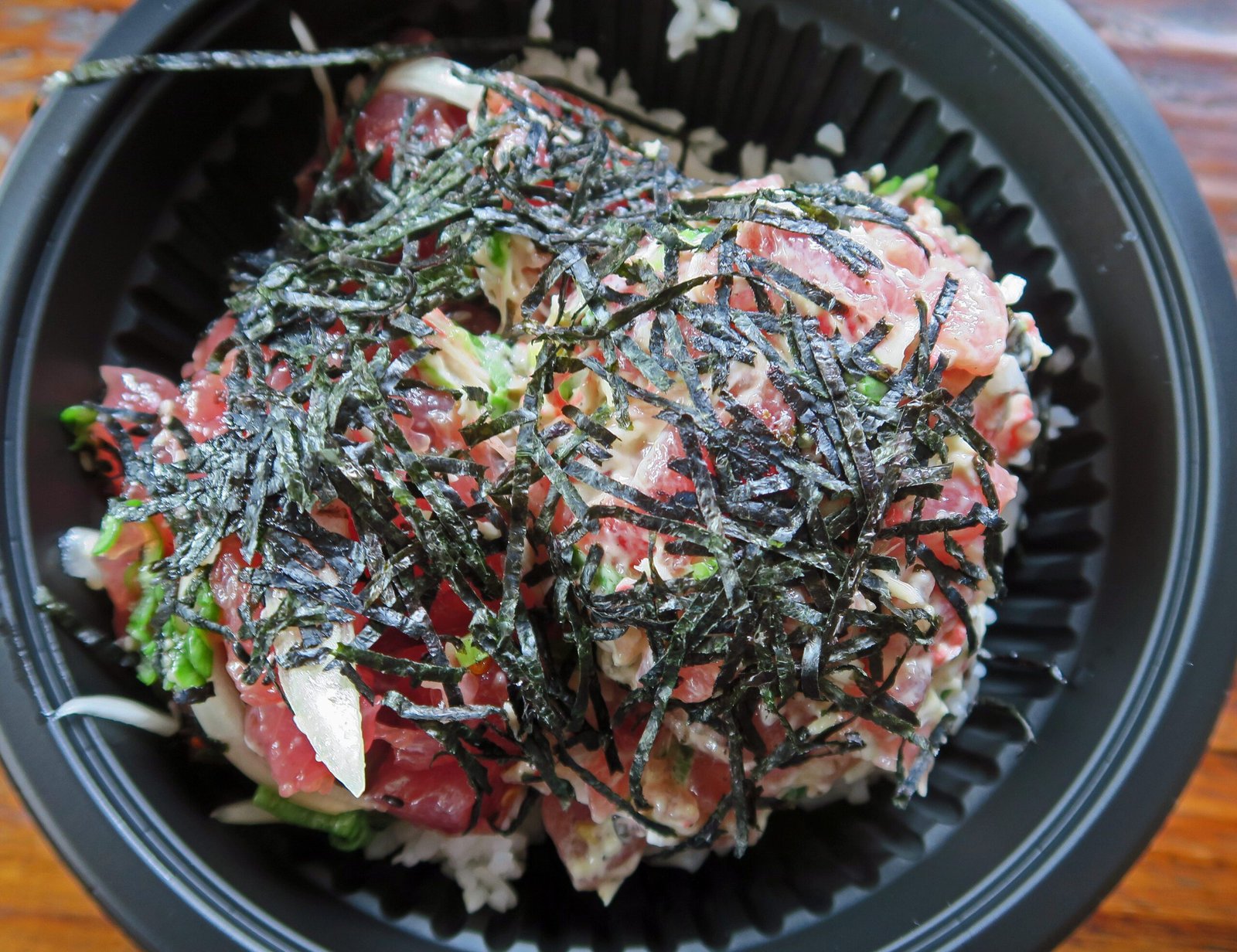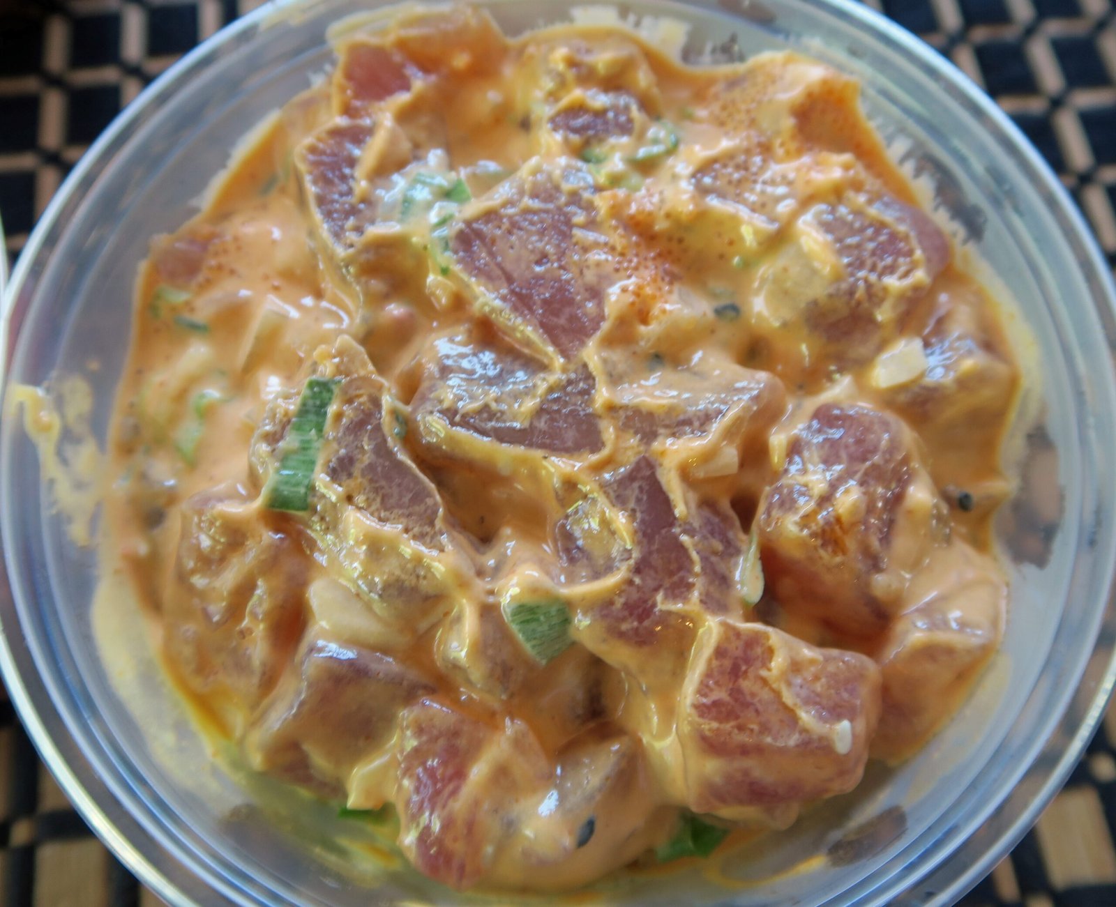 First thing I noticed was the quality of the fish; no "sugi" (connective tissue), the fish had the perfect, slight buttery-meatiness to it. The Shoyu Ahi had been nicely seasoned, not overdone, but well coated, not overly salty; the texture as quite good. There was a bit too much mayo on the California Ahi for me; and just a bit too much "stuff". But man, the texture of the fish is what got me. Let's not get too overblown with this….this isn't as good as our favorites back home; but it's good enough to be at what I call "good supermarket" level for the islands.