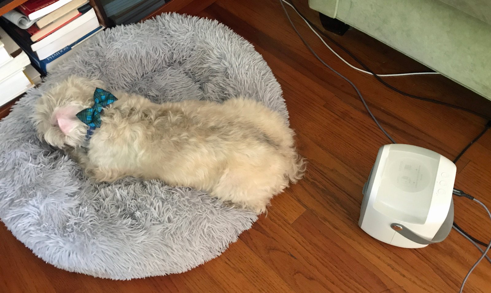 I mentioned getting a swamp cooler for Frankie – I actually have two. I use one in our home office. I've noticed that F has a certain part of his anatomy that is a priority to keep cool…..guess where that is?