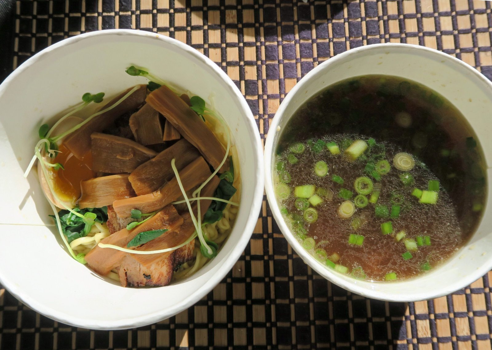 I then poured the broth around the edges of the bowl and slowly worked to unclump the noodles. This worked fine. Also because it took a couple of minutes, it also warmed up the ajitama, which was nice.