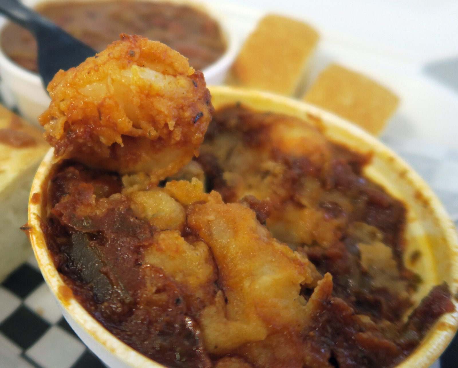 I really hadn't seen any photos of the Shrimp Creole and didn't realized that it was battered and fried before being put into the "gravy", which was a mixed blessing. I'm sure the coating prevented the shrimp from getting too hard and rubbery; though all of the coating had started peeling off into the gravy. The shrimp also had a slight muddiness to it as well. The gravy was super thick….I'm used to shrimp creole having a "bisque like" consistency; this was an almost solid "blob". The flavor was decent; perhaps a bit too much….I believe it was thyme that kinda overpowered things.