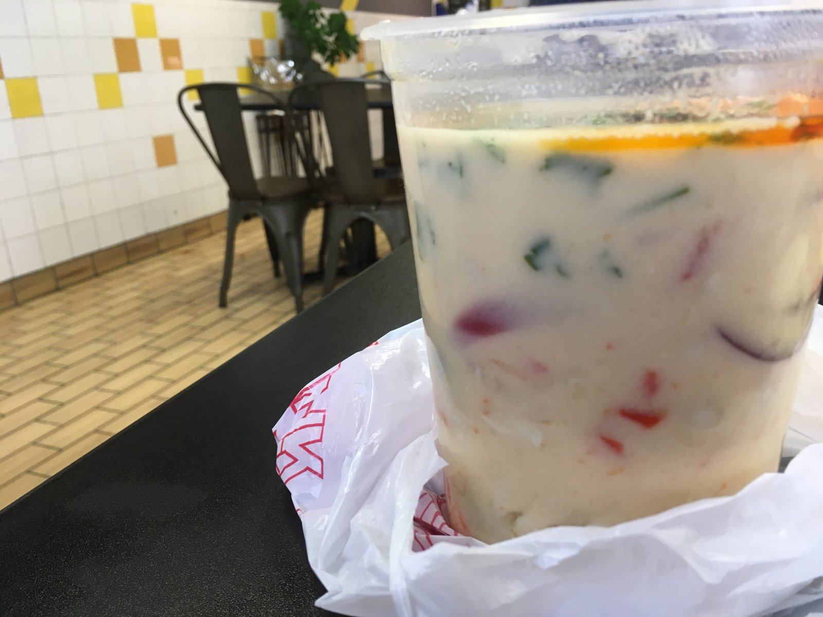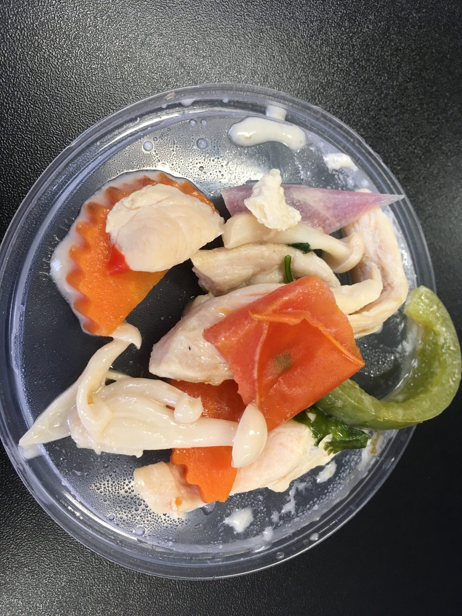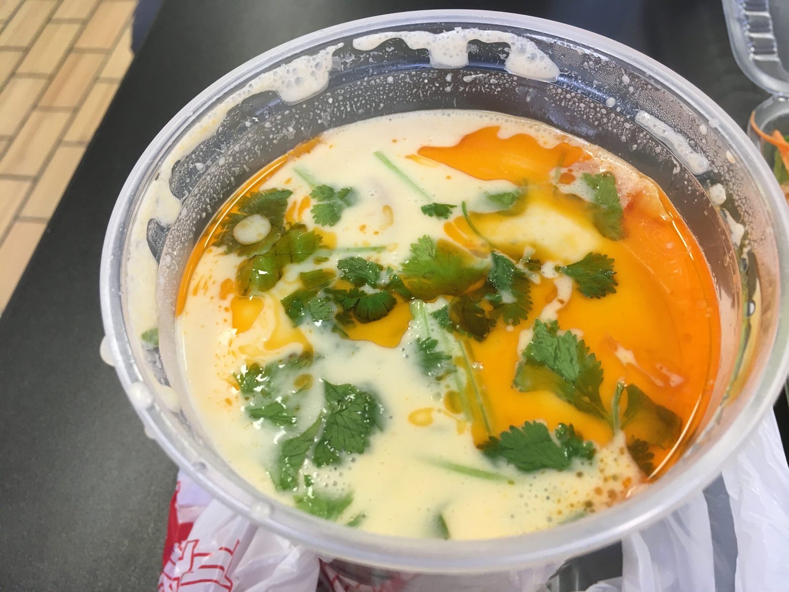 The large Tom Kha soup with chicken ($8.50) was served hot and 'to go', even though we ate most of it inside. Coconut based, with all of the ingredients seen here-bell peppers, carrot, tomato, onion, enoki mushrooms, lemongrass and lime leaves and plenty of chicken were a wonderful combination of flavors and spices and spiciness (we asked for a "1").